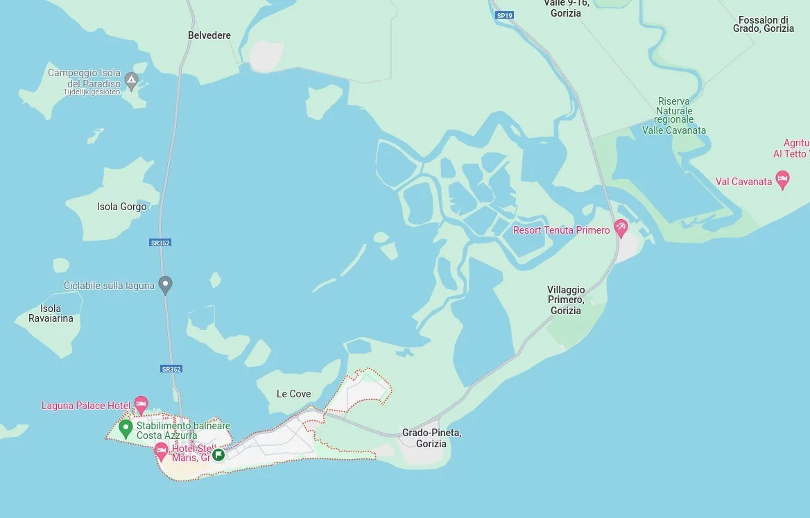 De oplevering staat gepland vanaf maandag, maar we gebruiken zondag alvast om de uitzet in de boot te laden. Volgens gedetailleerde briefing van de broker zou de boot in Grado liggen, een stadje, lokale toeristische trekpleister, op een soort schiereiland in moerassig gebied tussen land en zee. Geen idee waar de jachthaven is, maar dat lost Google Maps makkelijk op.