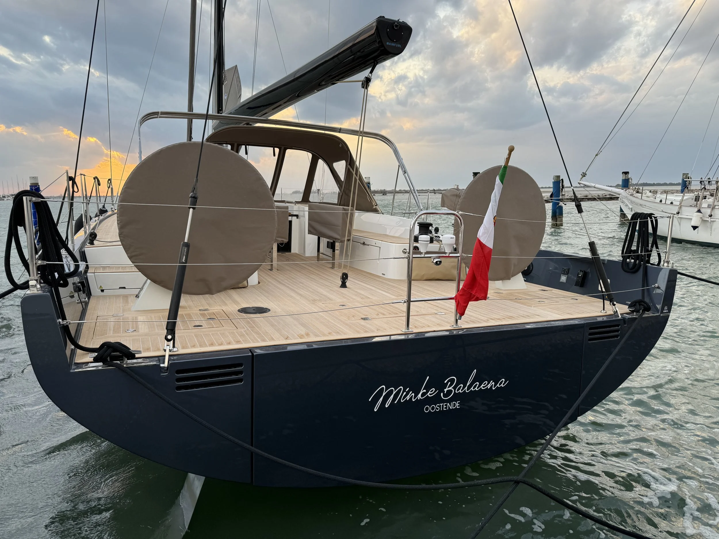 Zoals elke zichzelf-respecterende jachthaven is ook deze gesloten op zondag. De magische term Solaris geeft ons echter toegang tot wat een kruising tussen een jachthaven en een werf blijkt te zijn. En ja, helemaal achteraan ligt hij dan, een splinternieuwe Solaris 50, helemaal klaar, met opschrift Minke Balaena, Oostende.