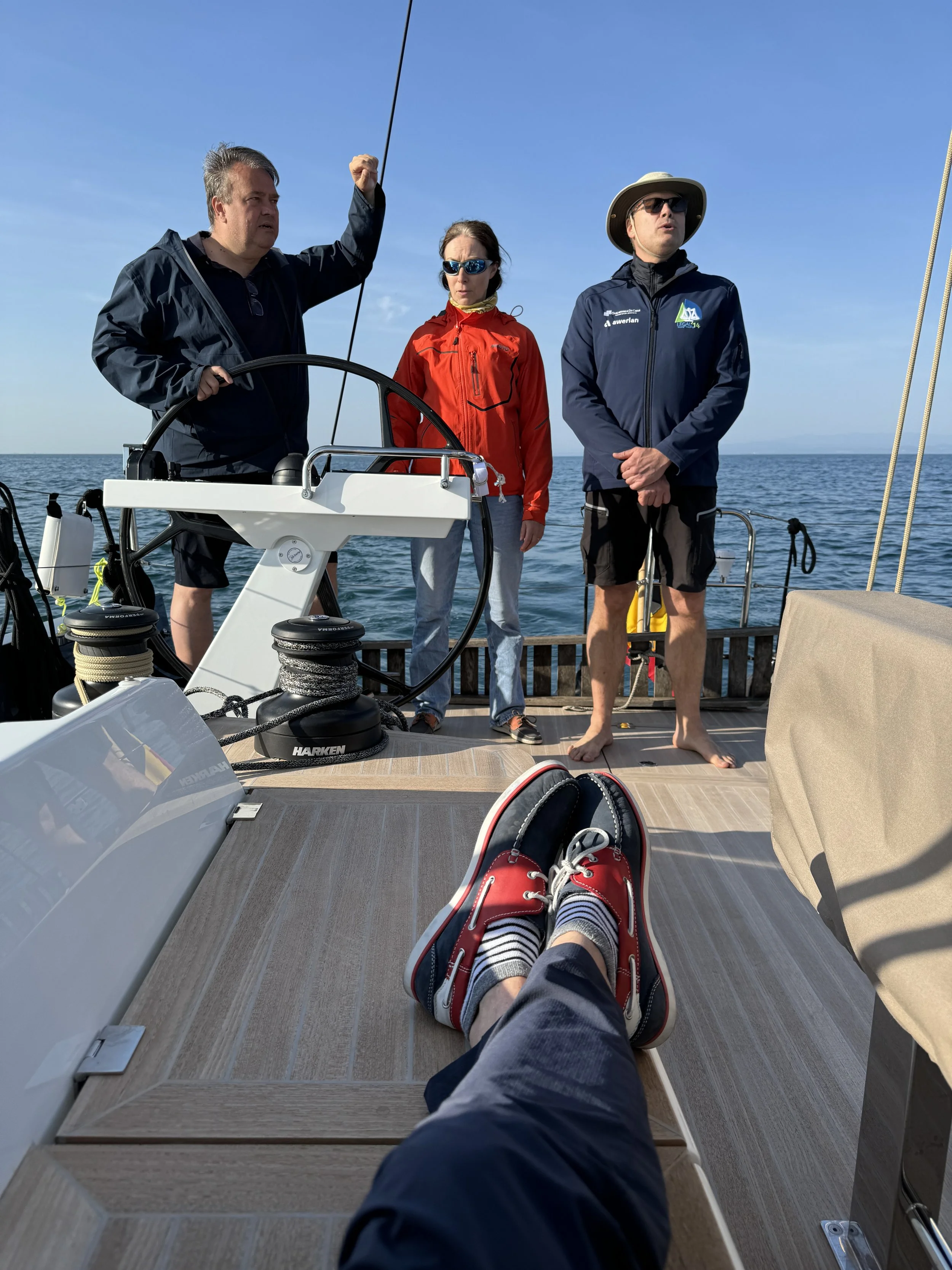 Na overleg met Solaris wordt beslist de voormiddag te gebruiken om de zeilen nogmaals te testen. Vooral het oprollen van het grootzeil, wat tijdens de eerste tests de nodige problemen gaf, en de helix genakker, die we tot op heden nog niet hebben kunnen uitproberen. Zo krijgen ook Daphne en Michael de werking uitgelegd uit eerste hand.
