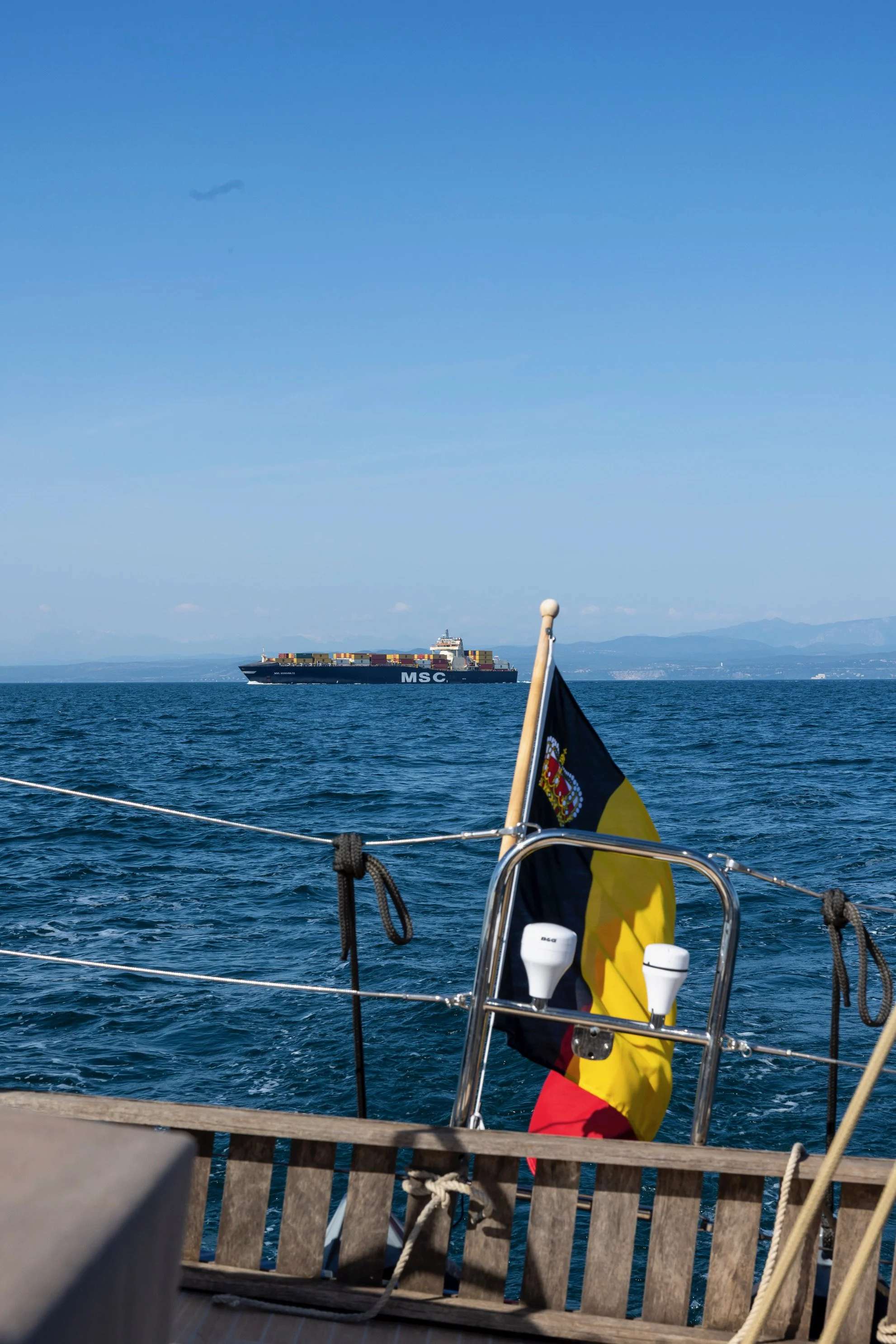 De omstandigheden op de Adriatische zee zijn zacht. Veel zon. Er waait een matige wind, 10 tot 11 knopen, 3 beaufort, vlakke zee. We varen op grootzeil en fok, vooreerst scherp, later halve wind, omwille van de kromming van de kust van Istrië en om de vaarroute van de professionele scheepvaart vanuit Monfalcone en Trieste te vermijden. We halen daarbij licht meer dan 7 knopen. Op weg naar Umag, onze eerste stopplaats in Kroatië, een traject van 40 km.