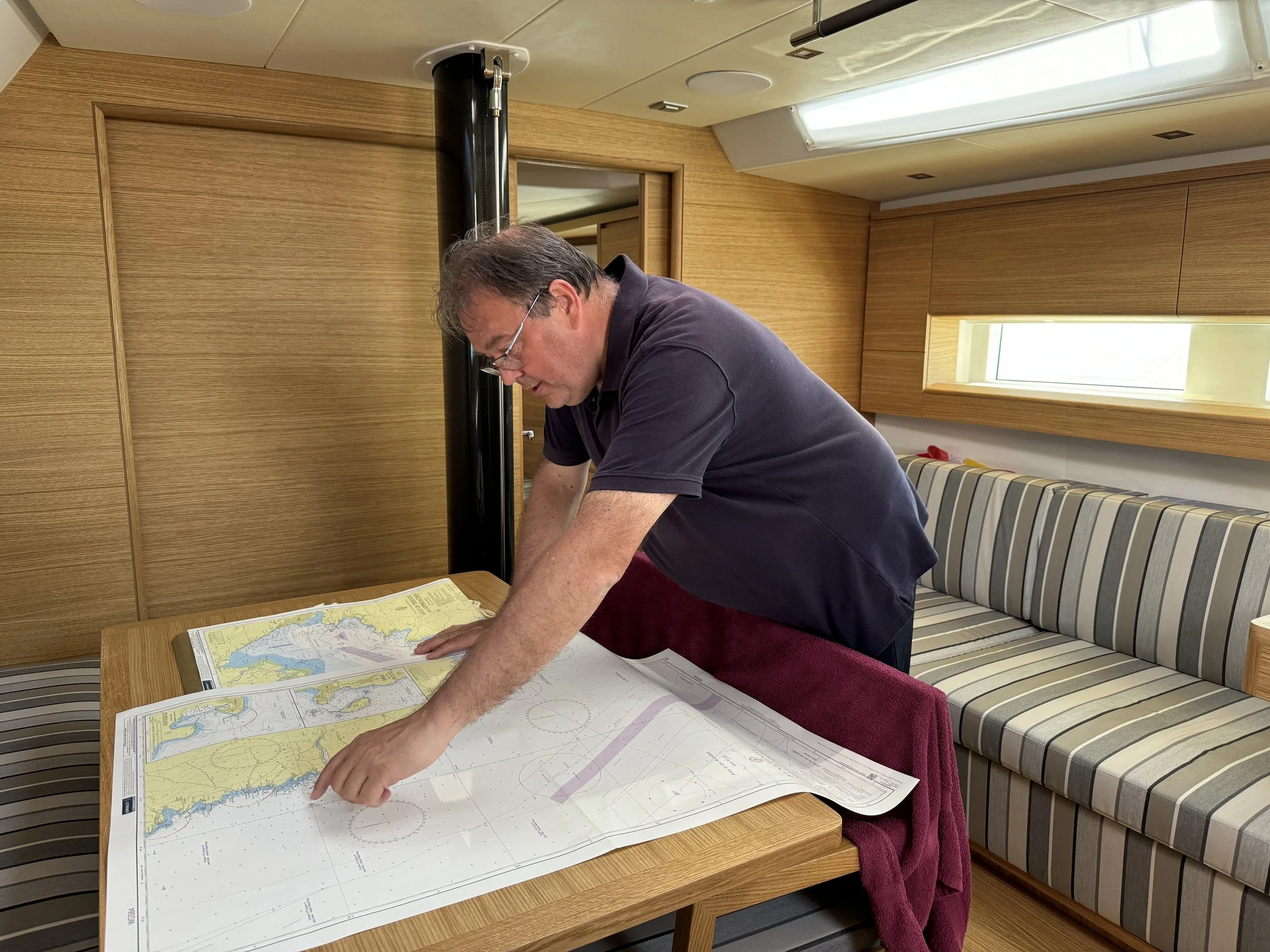 We komen al gauw tot de conclusie dat onze doelstelling veel te ambitieus is, en beslissen de trip te redden door op motor verder te varen. De motor, met z’n 75 pk, maakt 2.000 toeren per minuut, wat ons consistent boven de 7 kn houdt.