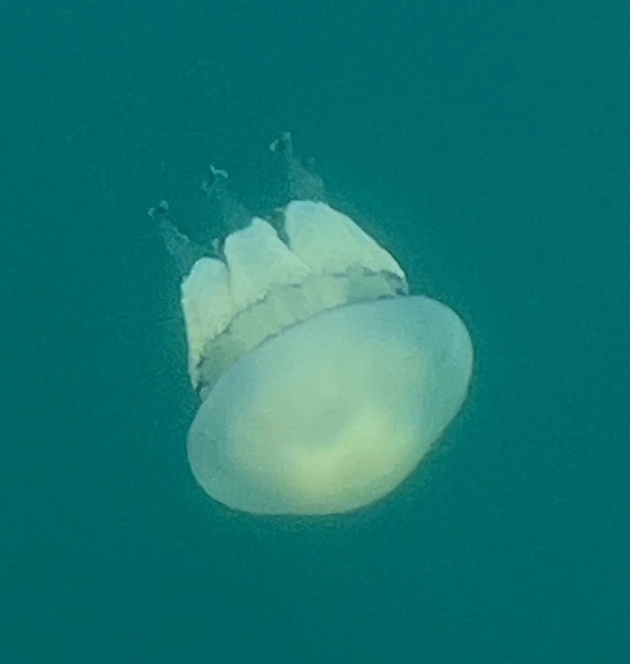 Tijdens het cruisen zien we een glimp van een groep dolfijnen, ver en vluchtig. Ontelbare kwallen zweven in het water waar de boot zich een weg doorheen baant, als nimfen van de zee.