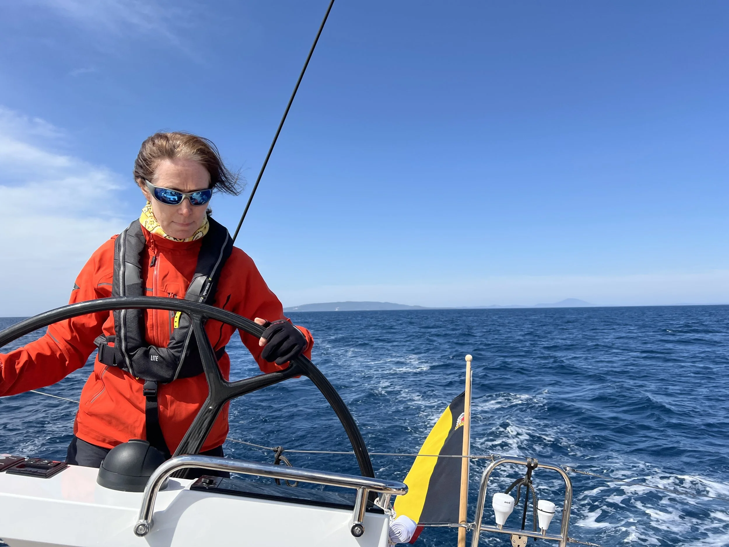 Het eerste deel van het traject is pal zuid georiënteerd, evenwijdig het het eiland. Bovendien hebben we open zee aan stuurboord, met golven tot 1.5m, relatief onaangenaam om te bevaren. We varen dit eerste deel daarom op motor. Nog steeds halen we 7 kn, maar het is werken aan het roer. Werken, en dan nog stampt de boot soms vervaarlijk. Het lijkt wel of we op de Noordzee varen, dus reddingsvesten aan.