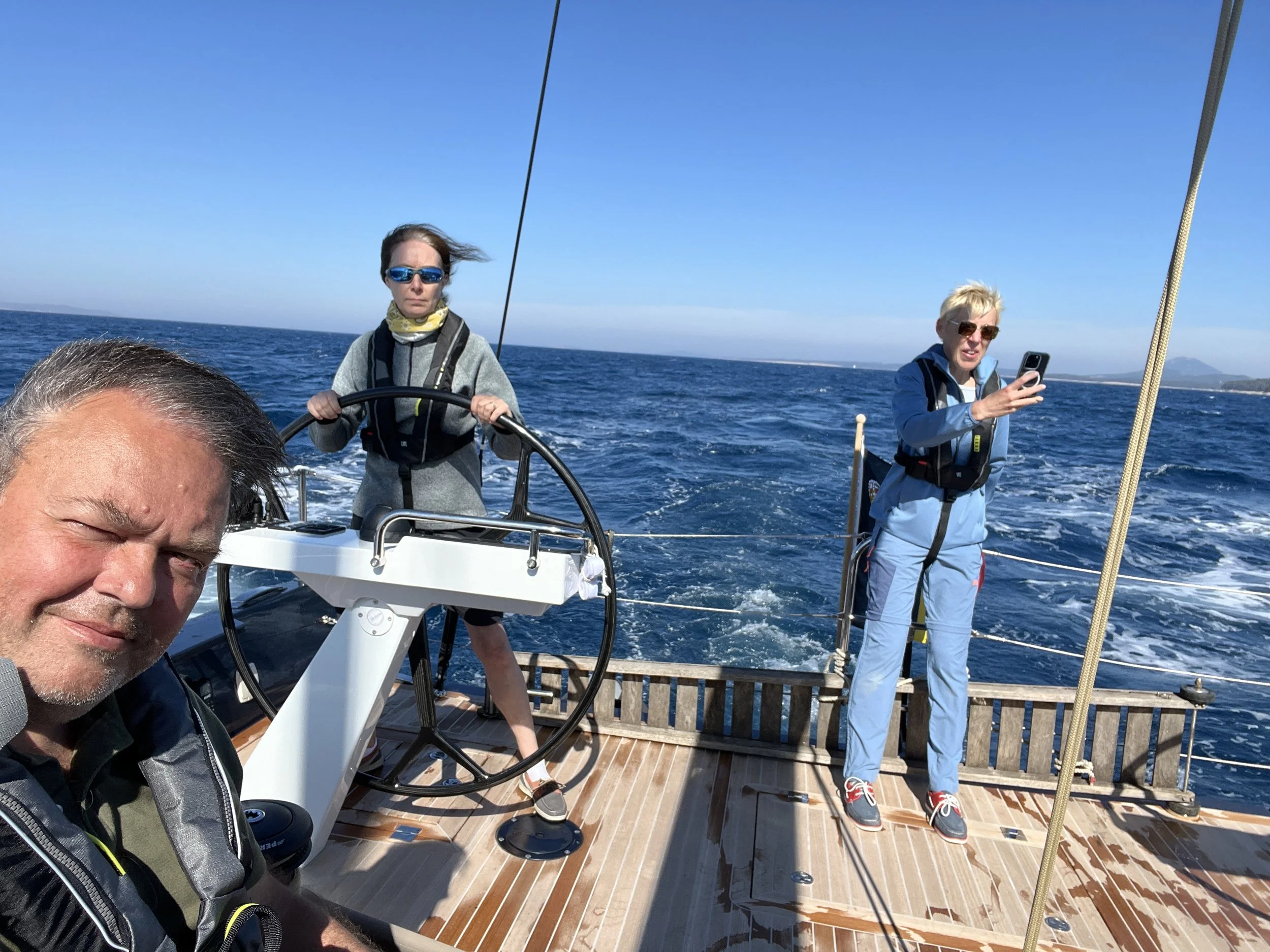 Eens de zuidelijkste punt van het eiland gepasseerd, wenden we licht naar het oosten, in de windschaduw van de volgende eilanden: Premuda, Molat en Sestrunj. De zee is hier kalmer, en de nieuwe koers is bezeild. We zetten het grootzeil op met dubbele reef, en een volle fok. De motor gaat uit en varen een scherpe koers aan 7 tot 8 kn. Dit blijft sportief varen, maar veel aangenamer. Op een gegeven moment halen we zelfs 8.3 kn, en dat met een dubbele reef op het grootzeil.