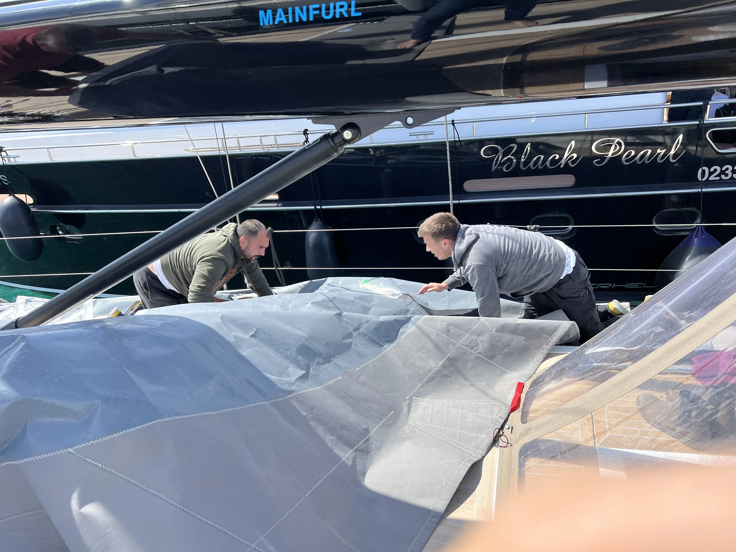 De heren van North Sails zetten zich aan het werk. De eerste opdracht is het grootzeil volledig uit de giek te krijgen. We hadden het grootzeil wel gestreken, maar door de blokkage bevindt het onderste deel van het grootzeil zich nog steeds in de giek, en is het nog steeds geblokeerd.