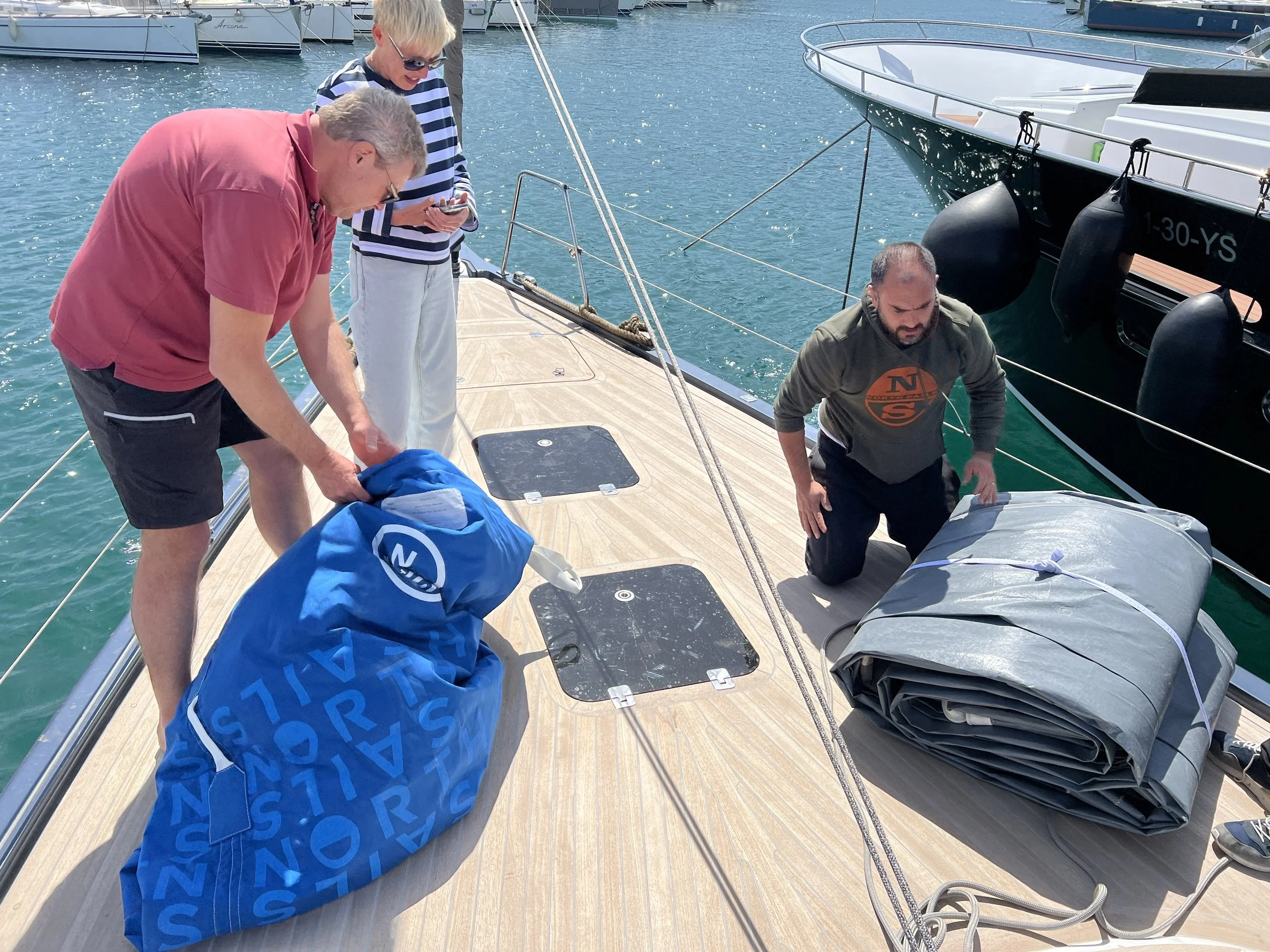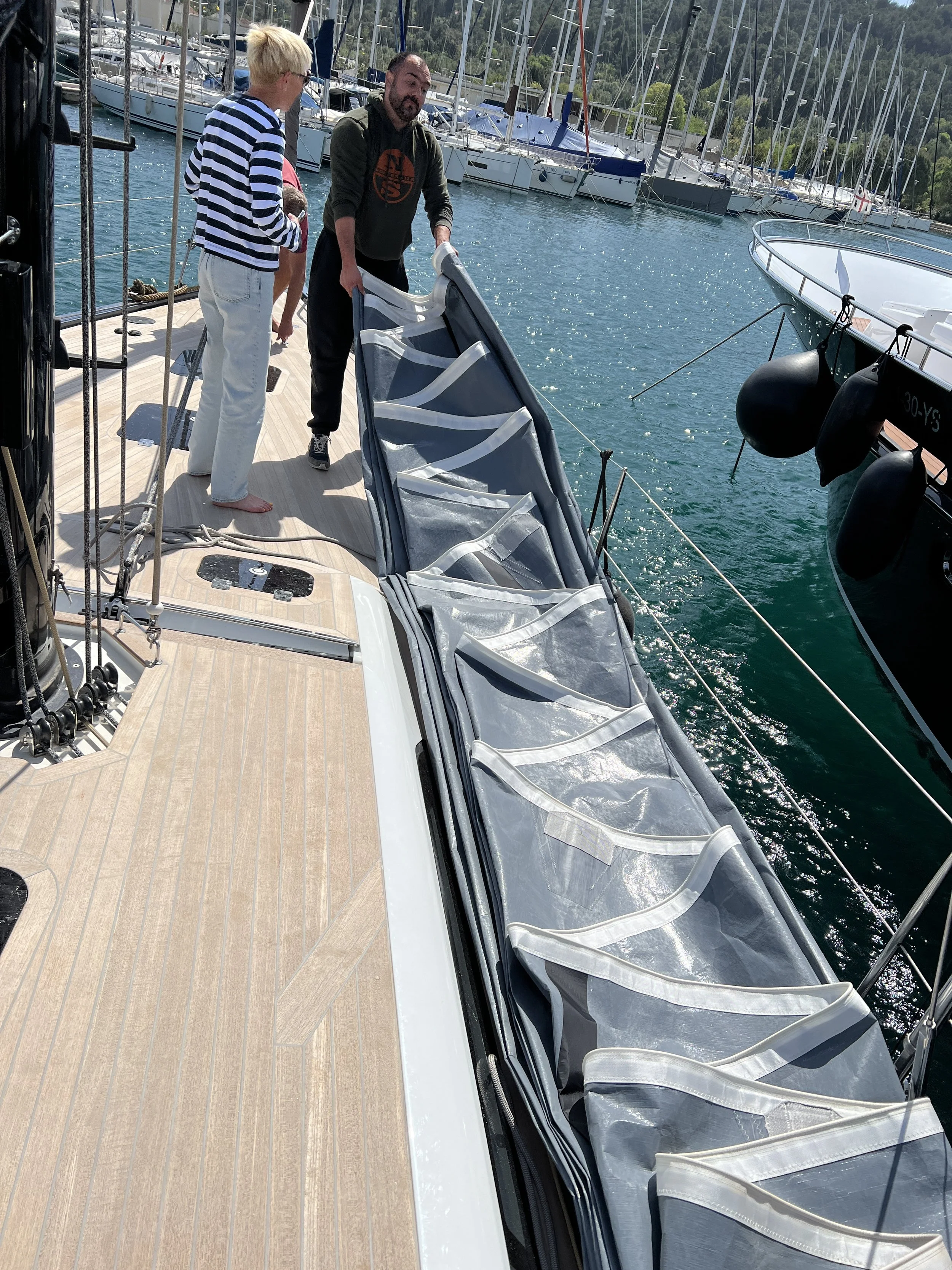 Het duurt meer dan een uur vooraleer er beweging komt in het grootzeil. Omdat het toch nog wat waait in de marina, komen alle handen van pas om het grootzeil volledig uit de giek te halen, en het daarna nestjes op te vouwen, om kreuken te vermijden, en in de zeilkamer te bergen.