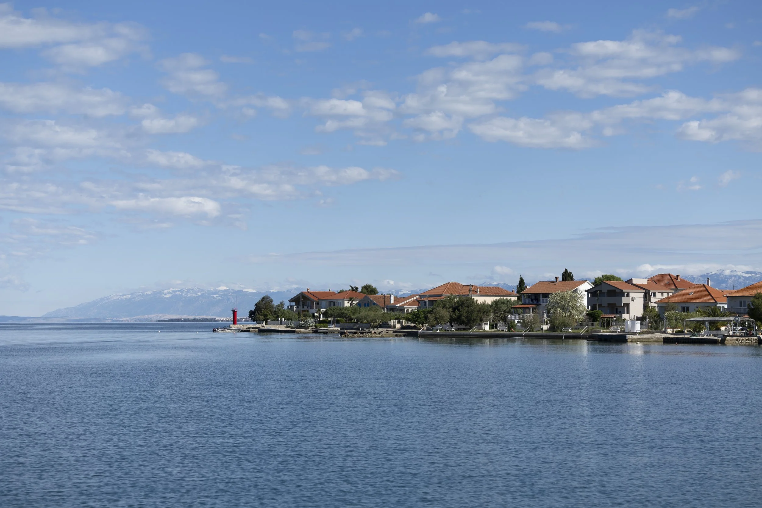 We varen buiten op motor en merken al snel dat de wind erg wisselvallig is, met stoten tot 20 kn. Geen weer voor de gennaker. We ontrollen de fok, maar gereefd, omwille van de windstoten, en varen zo het zeekanaal tussen Ugljan en het vasteland uit.