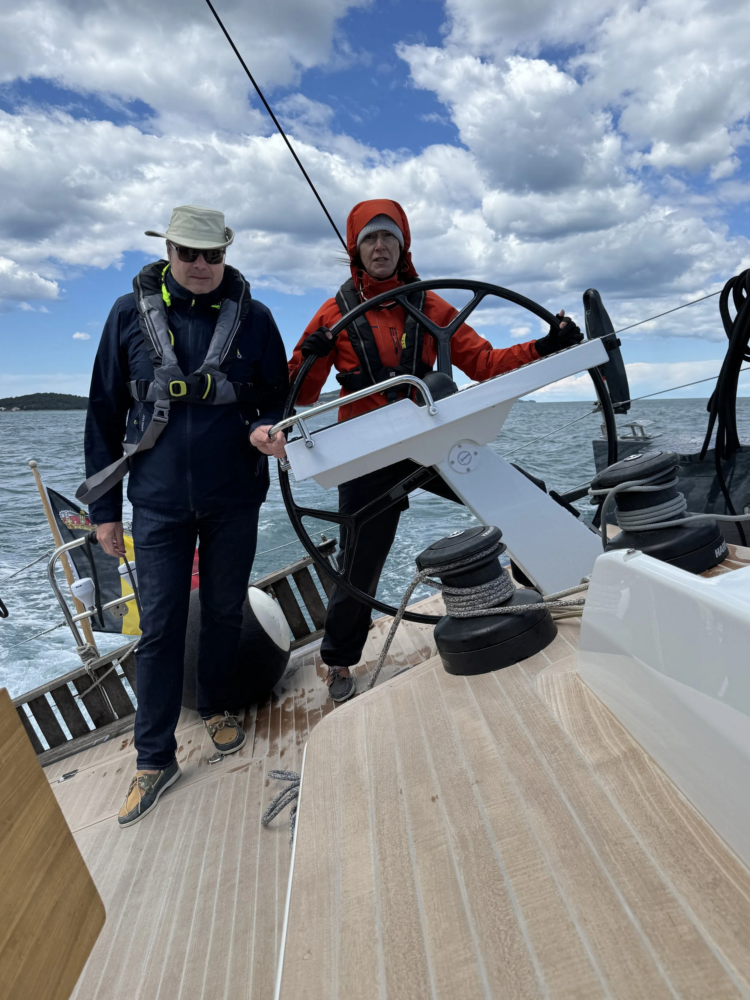 Ondanks het gebrek aan balans in de zeilen, ligt de boot nog steeds erg stabiel. De Bora brengt echter duidelijk koelere lucht. We kleden ons zoals je dat op de Noordzee zou doen, water- en winddicht. Wat een contrast met de vorige dagen.