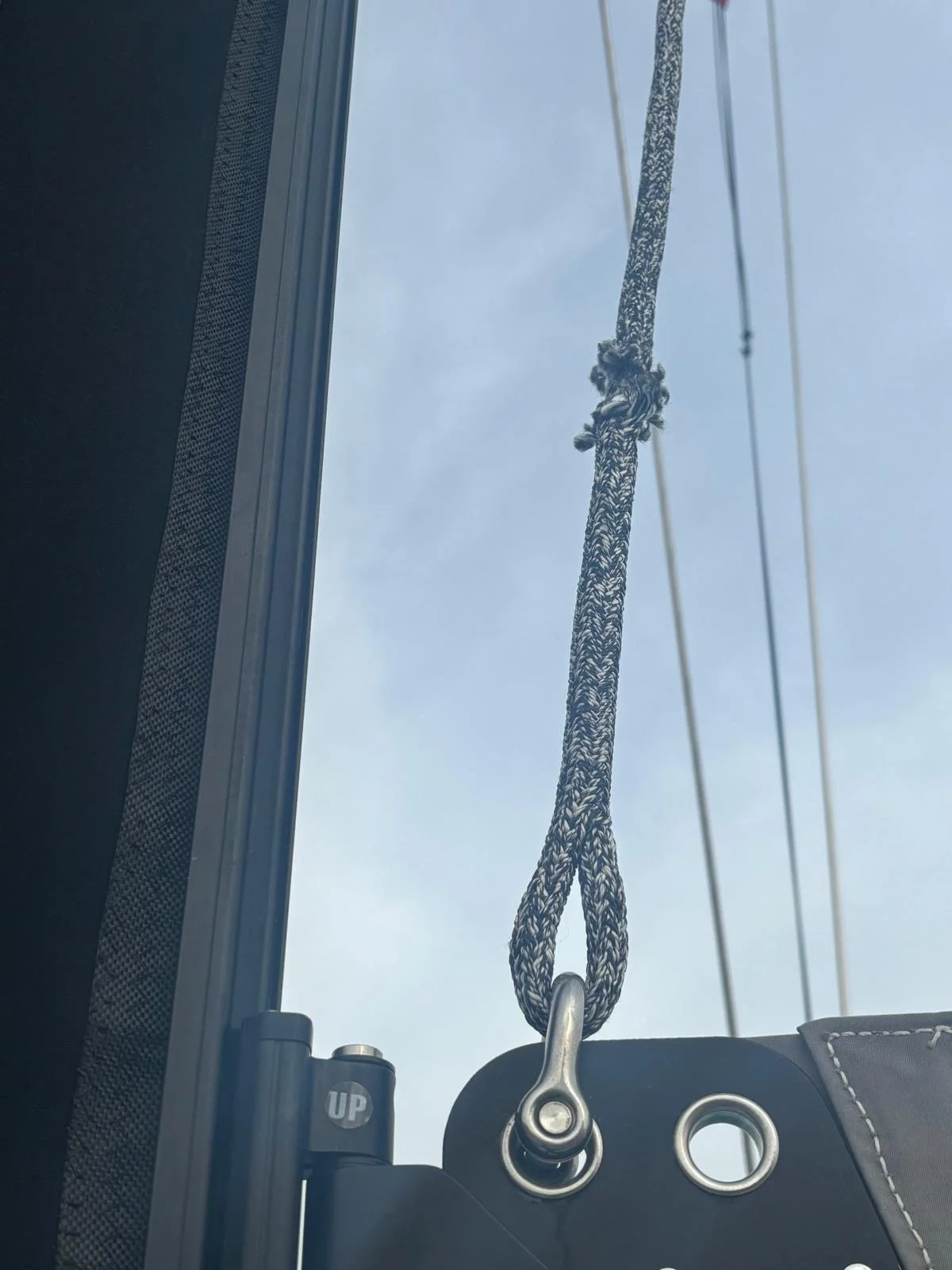 Tijdens het inspecteren van de boot blijkt dat de val van het grootzeil beschadigd is.