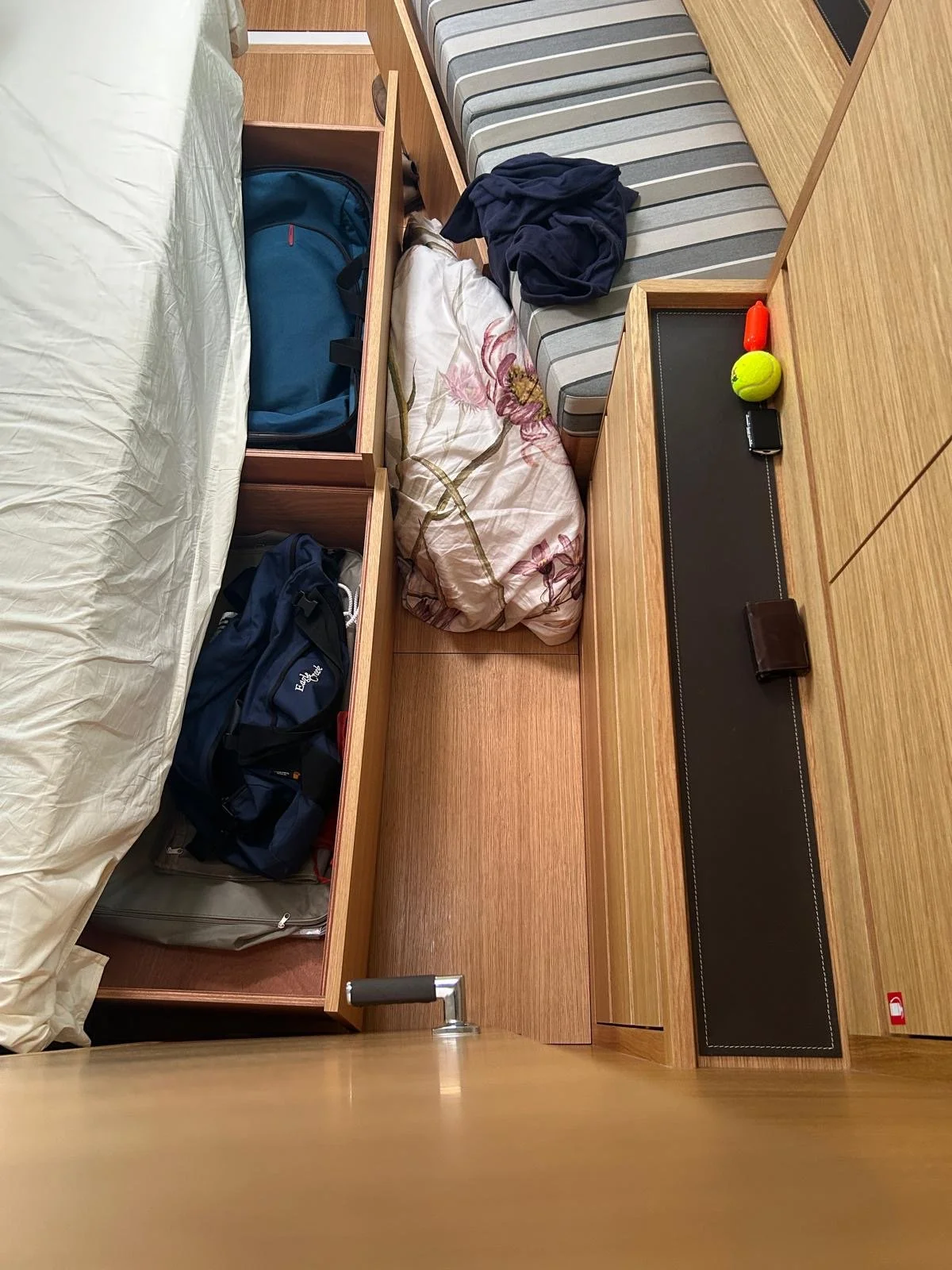 Groot is de verbijstering wanneer we opmerken dat de deur van de cabine vooraan geblokkeerd is. Er lijkt zich achter de deur een groot voorwerp te bevinden, en dat verhindert het openen van de deur. Merkwaardig, want de cabine was netjes opgeruimd, zoals het een zeevaarder betaamt, en er liggen geen losse, grote voorwerpen. Met veel creativiteit en een beetje kracht slaagt Benoit erin een foto van de binnenkant van de cabine te maken met zijn mobiel, door een spleet boven de deur.