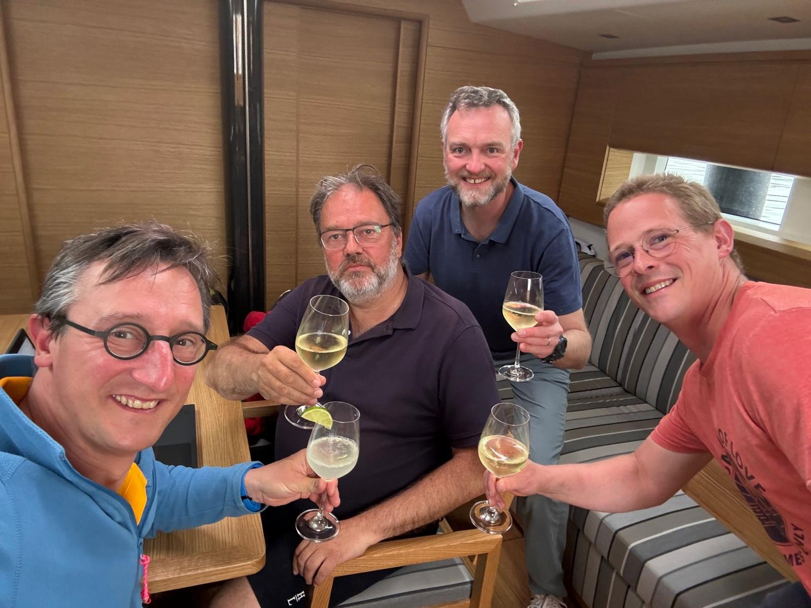 Het heeft lang geduurd, maar de Prosecco wordt eindelijk aangesproken, om het succes te vieren, en nieuwe vriendschappen te beklinken. Vijf dagen samen op zee, in uitdagende, vaak moeilijke omstandigheden, vormen een kader waar je mensen in snel tempo leert kennen. De samenwerking verliep ongedwongen en spontaan, maar ernstig, waar veiligheid voor alles kwam, en het team steeds primeerde op eigenbelang. Ik wens Benoit, Edgar en Sébastien te bedanken voor hun deelname aan deze trip, de open geest waarmee ze aan dit avontuur begonnen, en de toewijding en volharding waarmee het werd afgerond.