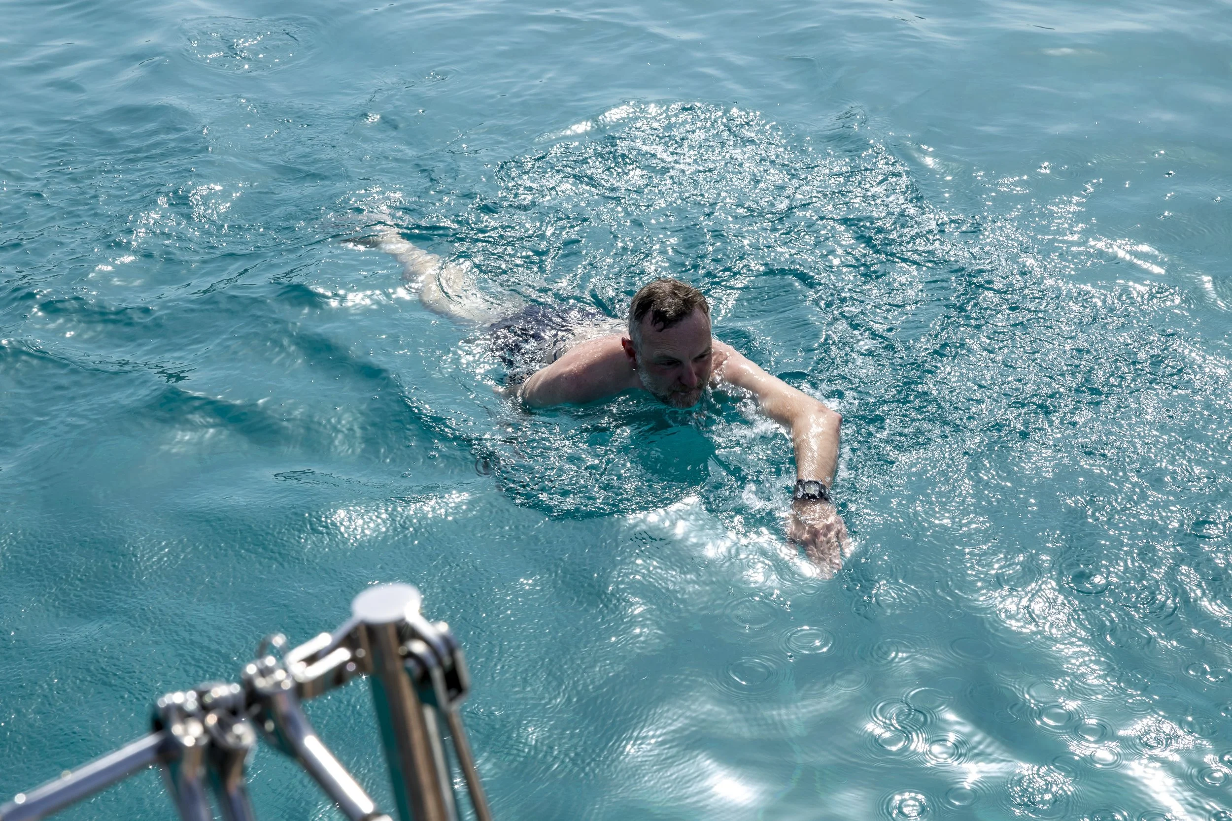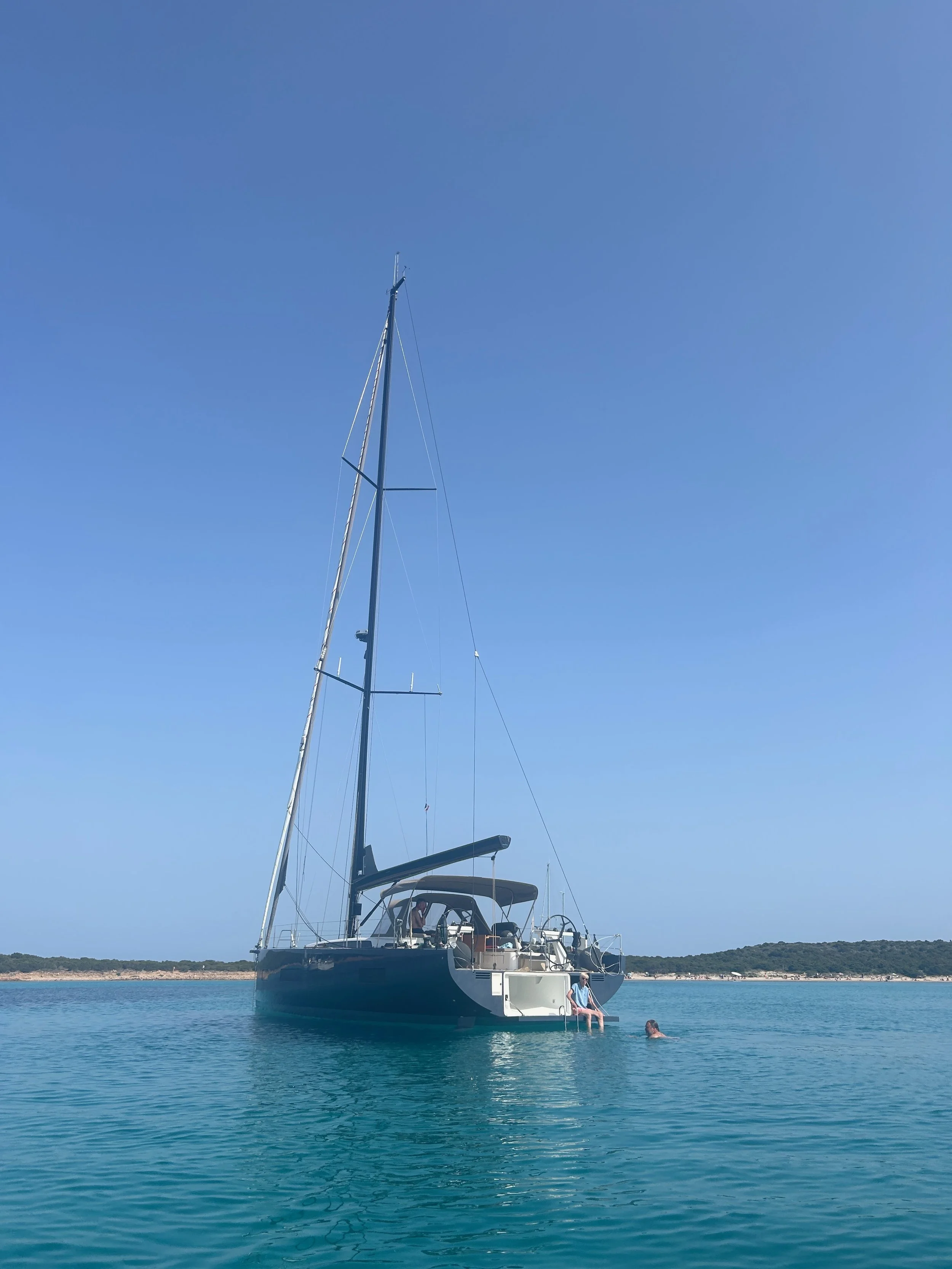 In een oogwenk wanen we ons in de tropen. We droppen het anker waar het blauw het mooist is, en pakken onze tropische accessoires uit. Met de transom neer hebben we een veilige en comfortabele toegang tot het water.