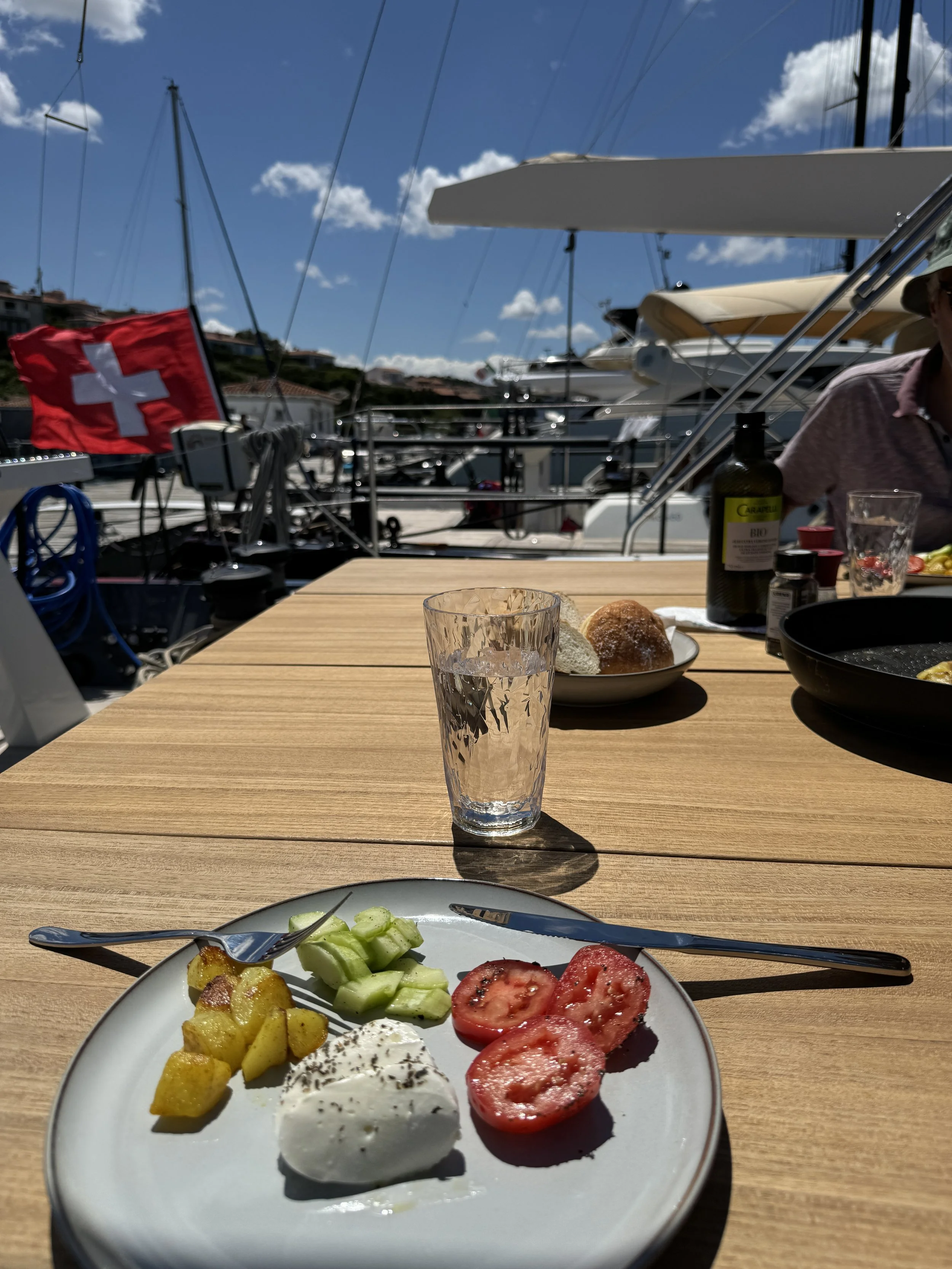 Pierre-Michel komt in de vooravond ingevlogen, en zorgt meteen al voor een leuke maaltijd op de boot, waarbij alle restje van de oversteek deskundig worden weggewerkt.