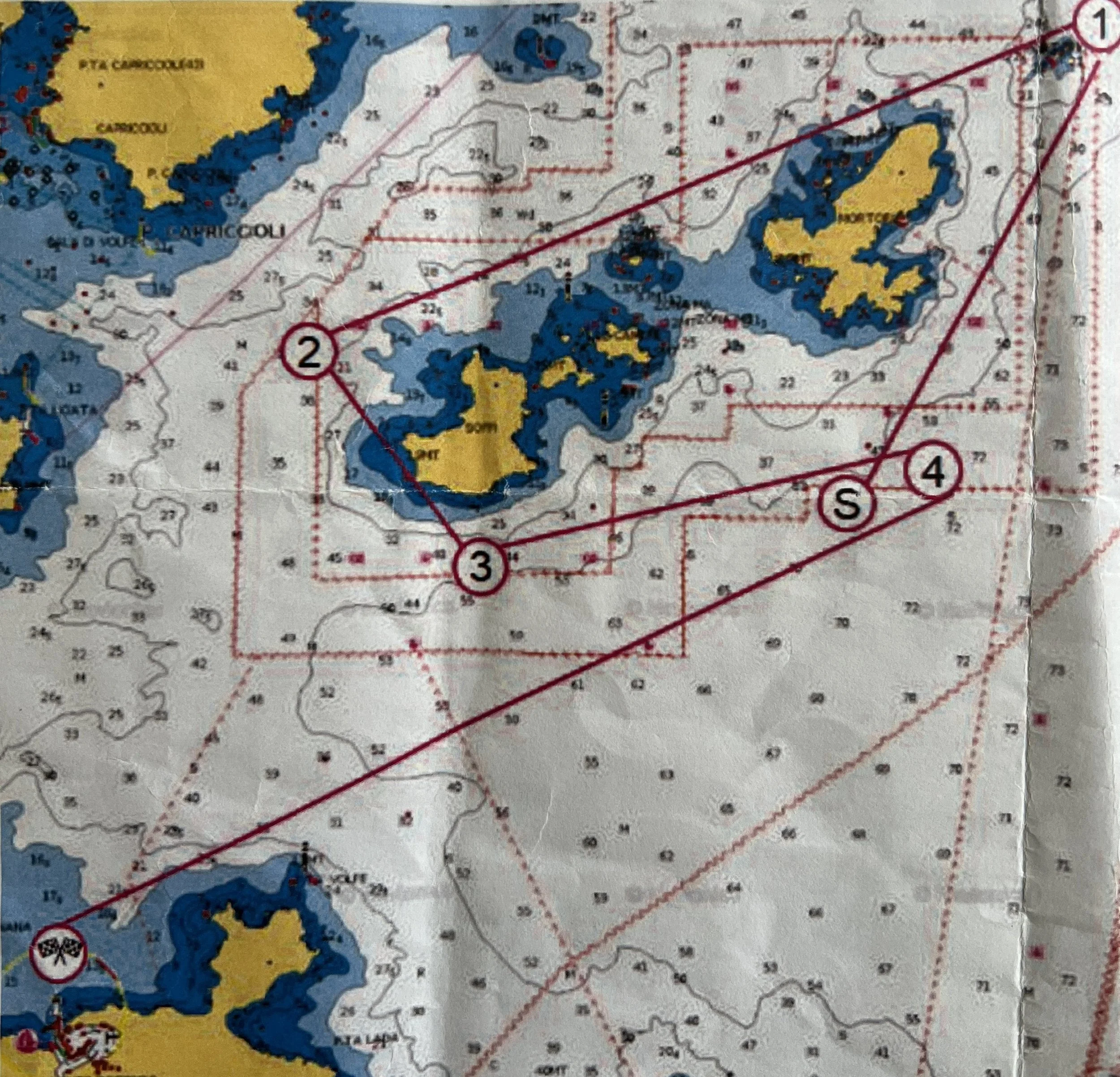 We starten bij mark S en eindigen aan de vlaggetjes. De instructies luiden: