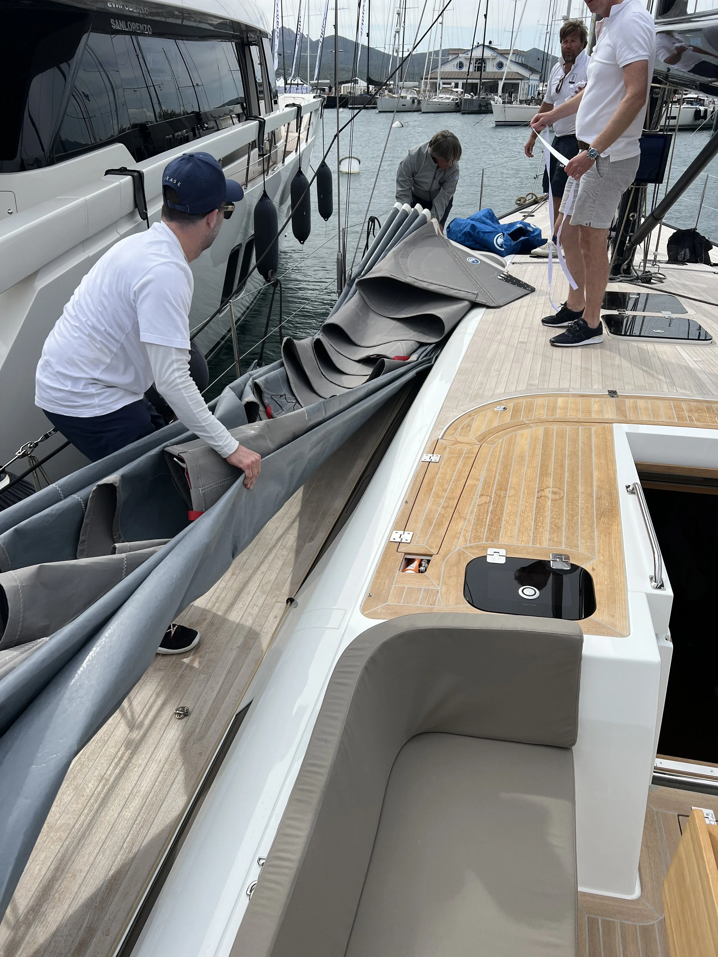 Later op de avond ontplooit zich een gelijkaardig scenario als tijdens onze rustdag in Kroatië. Deze keer zijn alle betrokken partijen reeds ter plaatse voor ondersteuning van de regatta. Het zeil wordt buiten de giek neergelaten, netjes opgevouwd, en opgehaald voor reparatie. Express, want de volgende ochtend kan het alweer terug gemonteerd worden. Garantie ook, een meevaller. En alles netjes tijdig klaar voor deelname aan de tweede regatta.