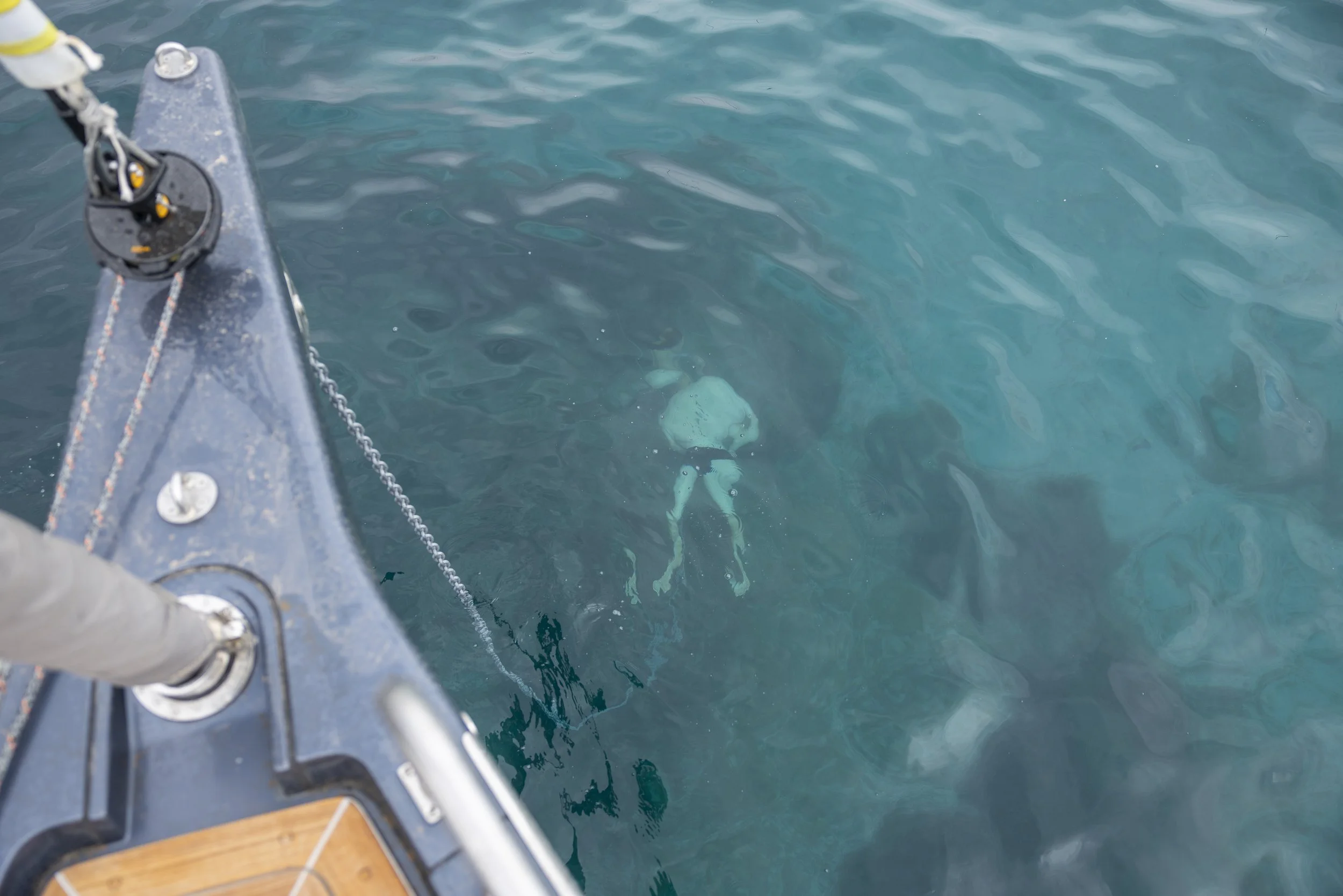 Wouter trekt zich aan het ankertouw naar beneden om de grip van het anker te inspecteren, maar 7m is iets te ambitieus. Dat belet ons niet van het water te genieten, ondanks de wisselvallige weersomstandigheden.