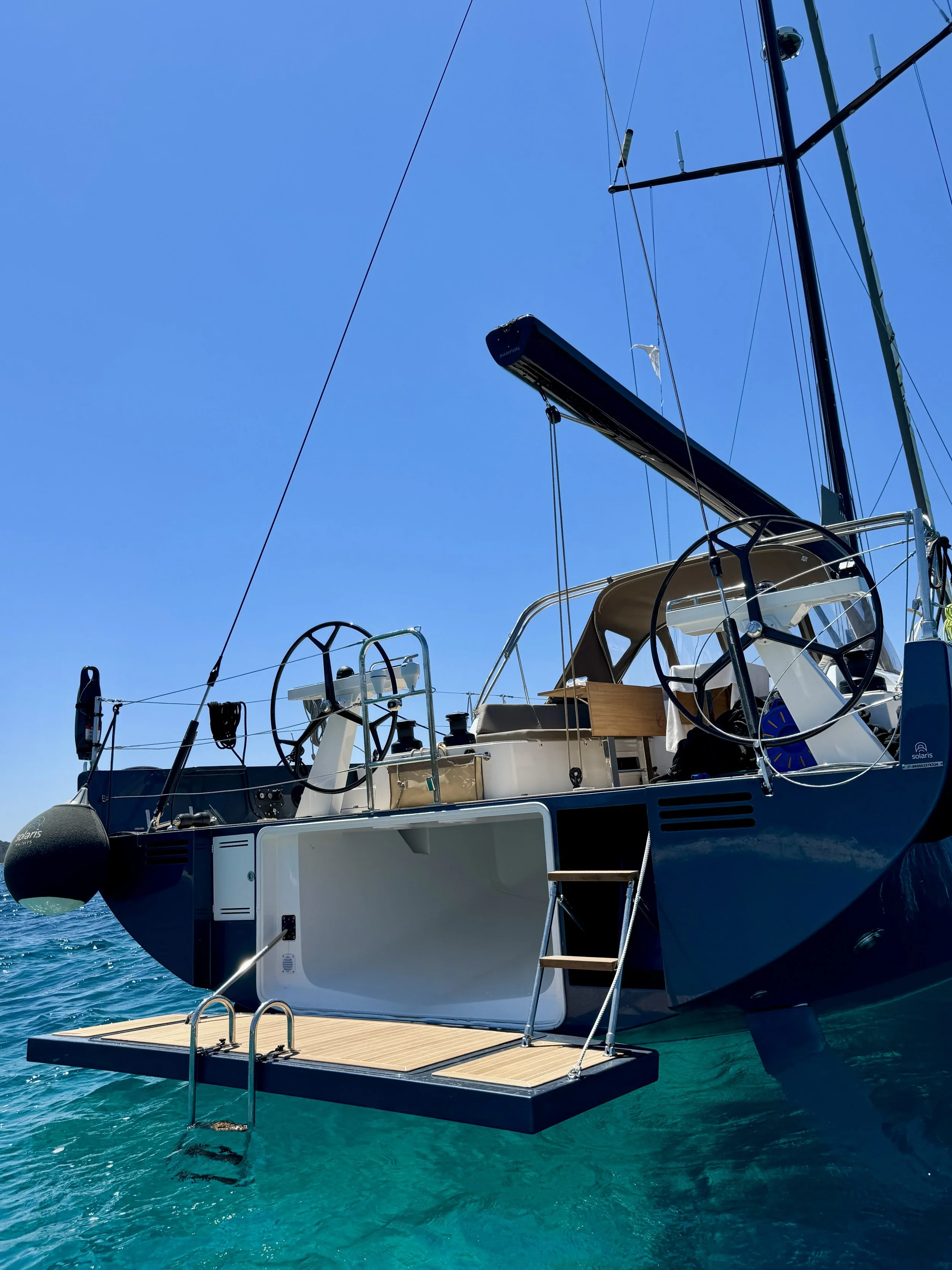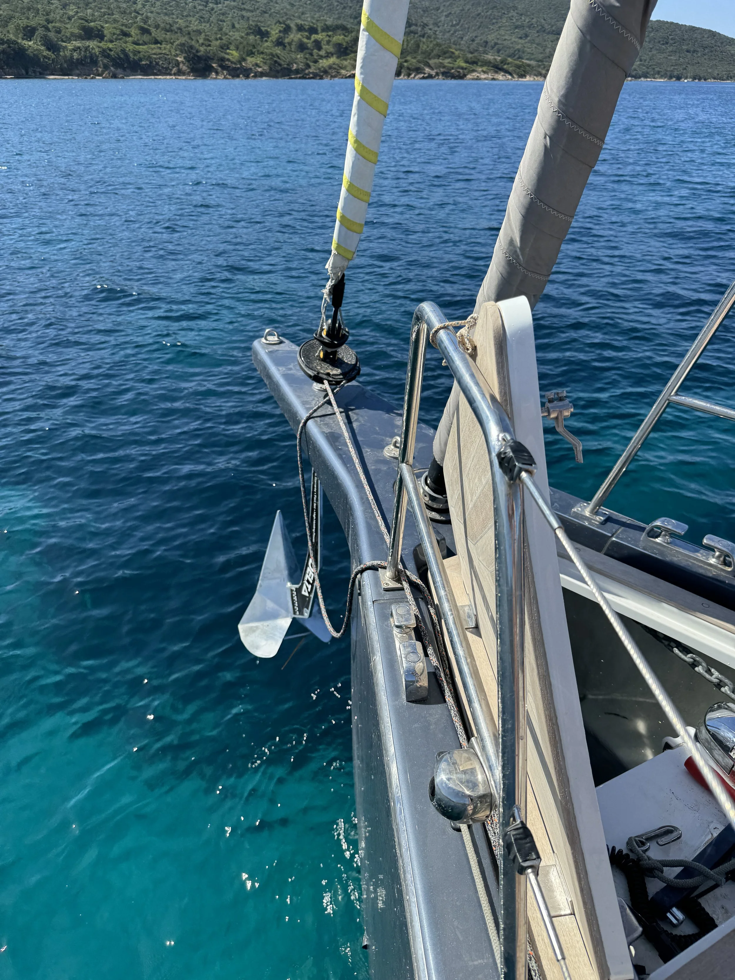 Net voor we in de baai aankomen, strijken we de zeilen. Ondertussen kennen we de gevoelige punten van de furler voor het grootzeil in de giek. Boeg in de wind, de giek met de juiste hoek tegenover de mast, en een paar extra ogen rechtstreeks op het oprollen van het zeil. Het loopt als een trein.