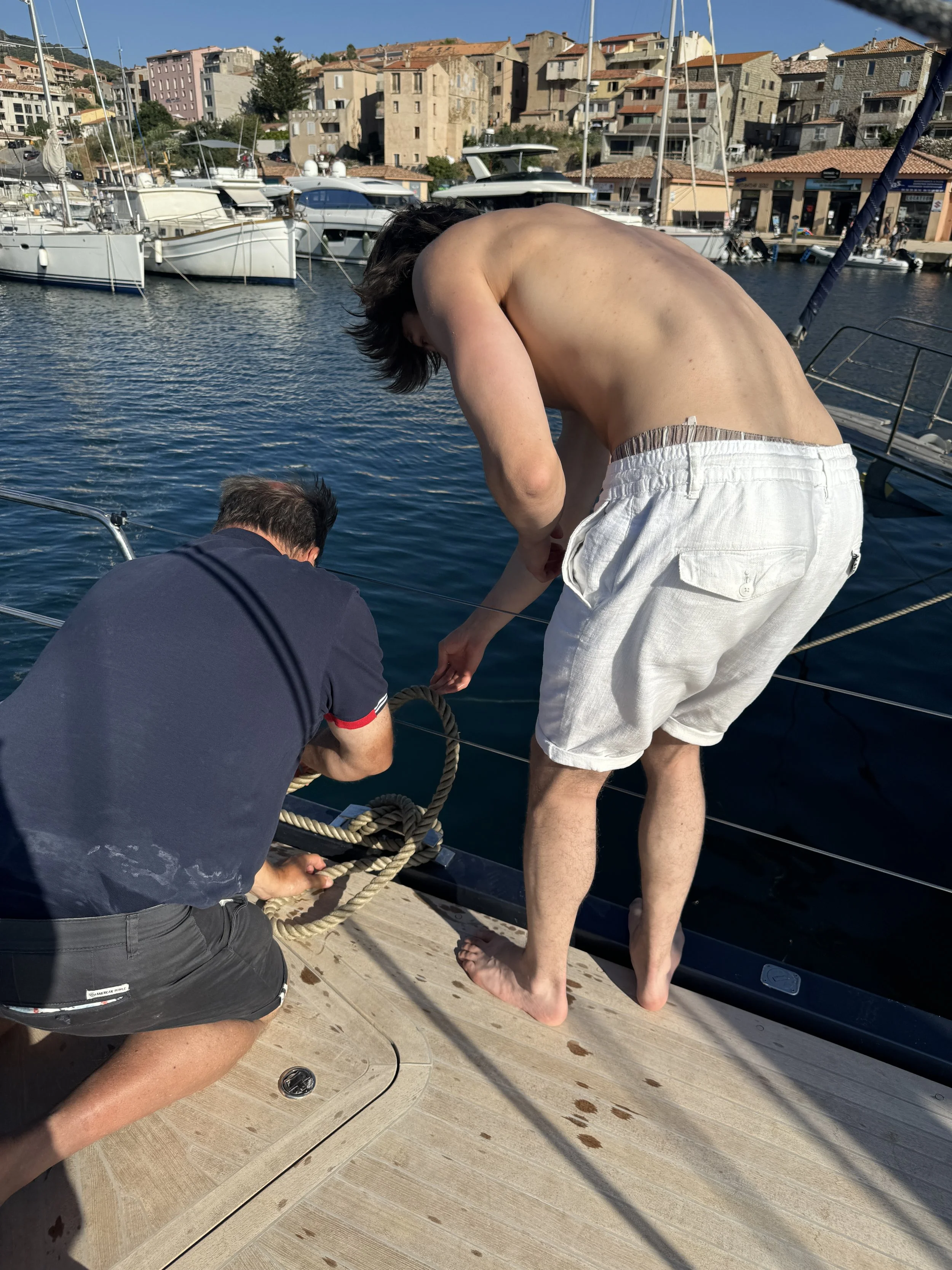 Vanuit Cupabia varen we om de landtong heen die de baai scheidt van Propriano, terug zuidwaarts weliswaar, alles bij elkaar een uurtje varen. Wanneer we de haven naderen worden zoals gebruikelijk de fenders opgehangen en de meertouwen voorbereid. Ditmaal gaat Robbe door het leertraject van knopen en andere technieken.