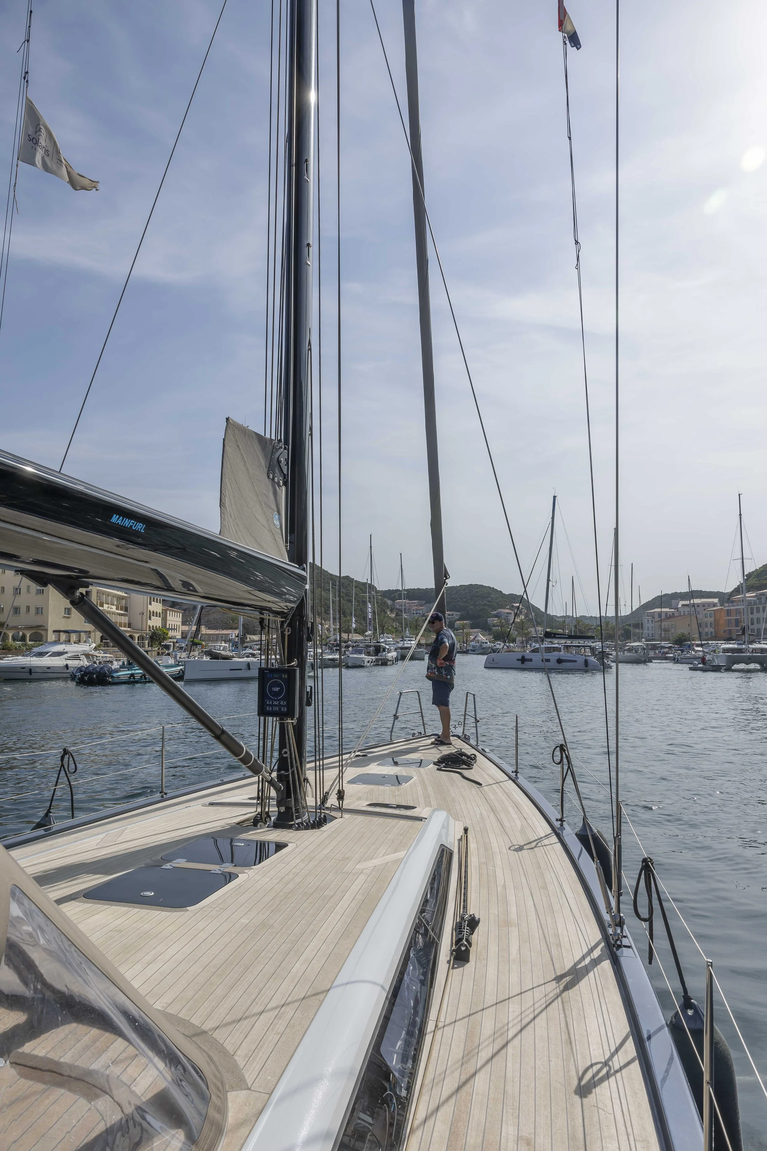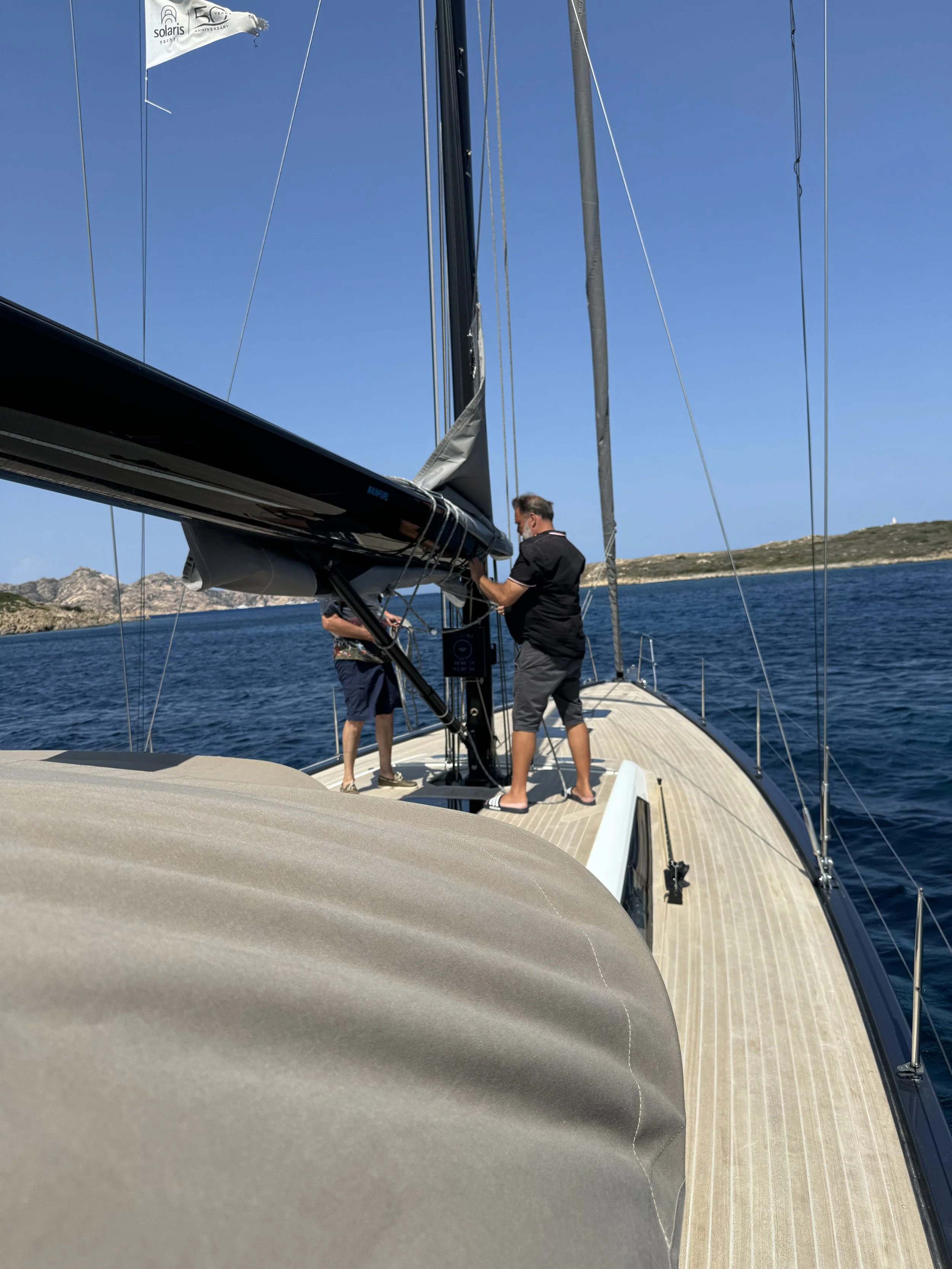 Eind mei vroegen we aan Marco, de service manager in Porto Rotondo, om dit touw te vervangen. Hij raadde aan hiermee te wachten tot na het seizoen. “Het zal zijn dienst tot dan nog wel doen.”, zei hij.