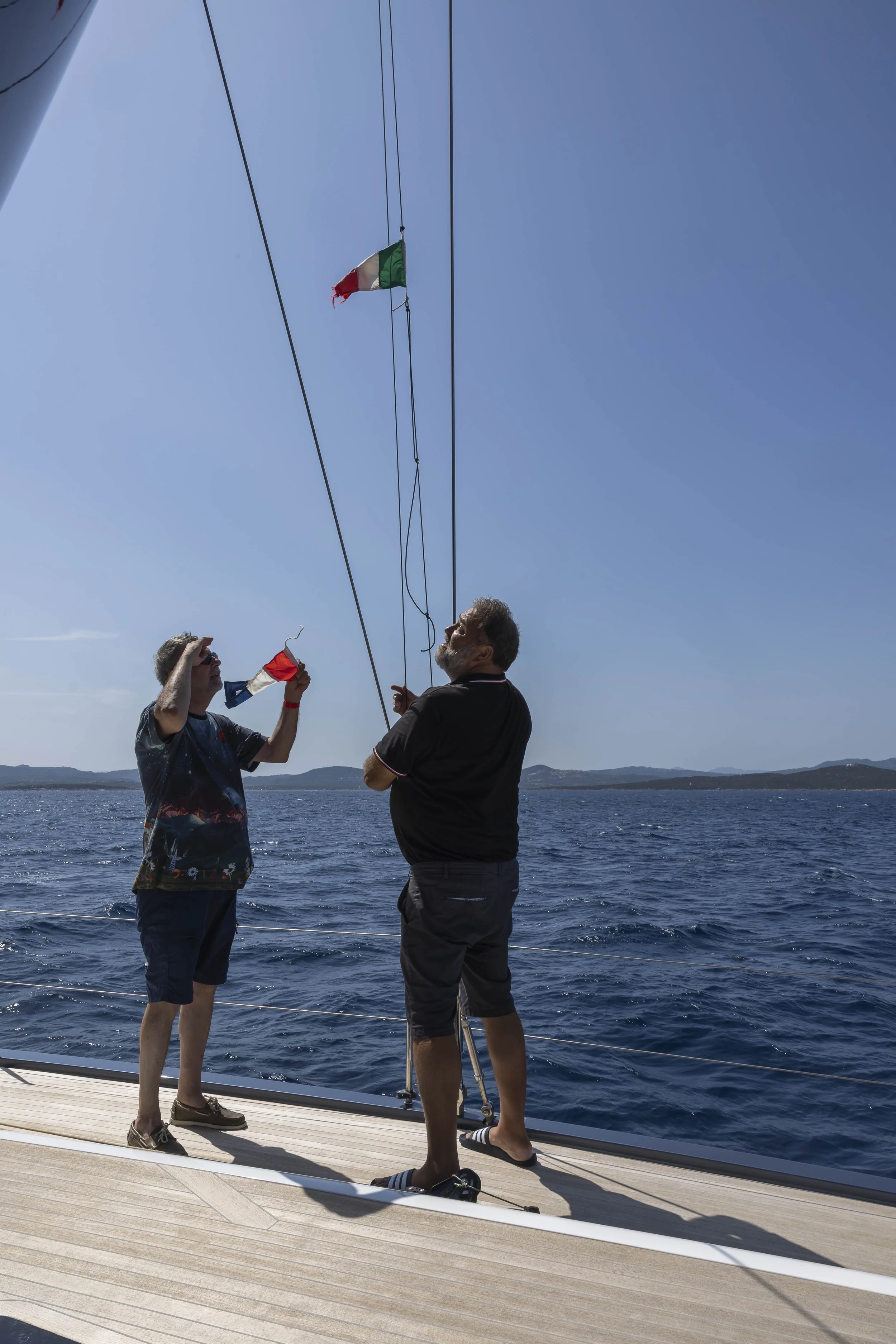 Ergens halfweg de oversteek nemen we ook de tijd om de courtesy vlag te vervangen. Het protocol wordt gewaarborgd door de professionele tussenkomst van Alain.