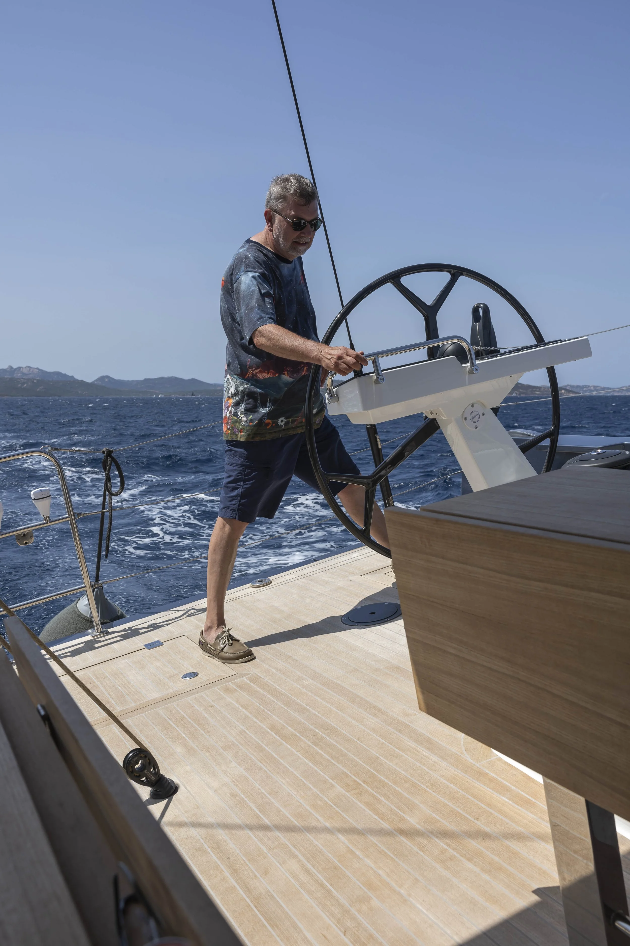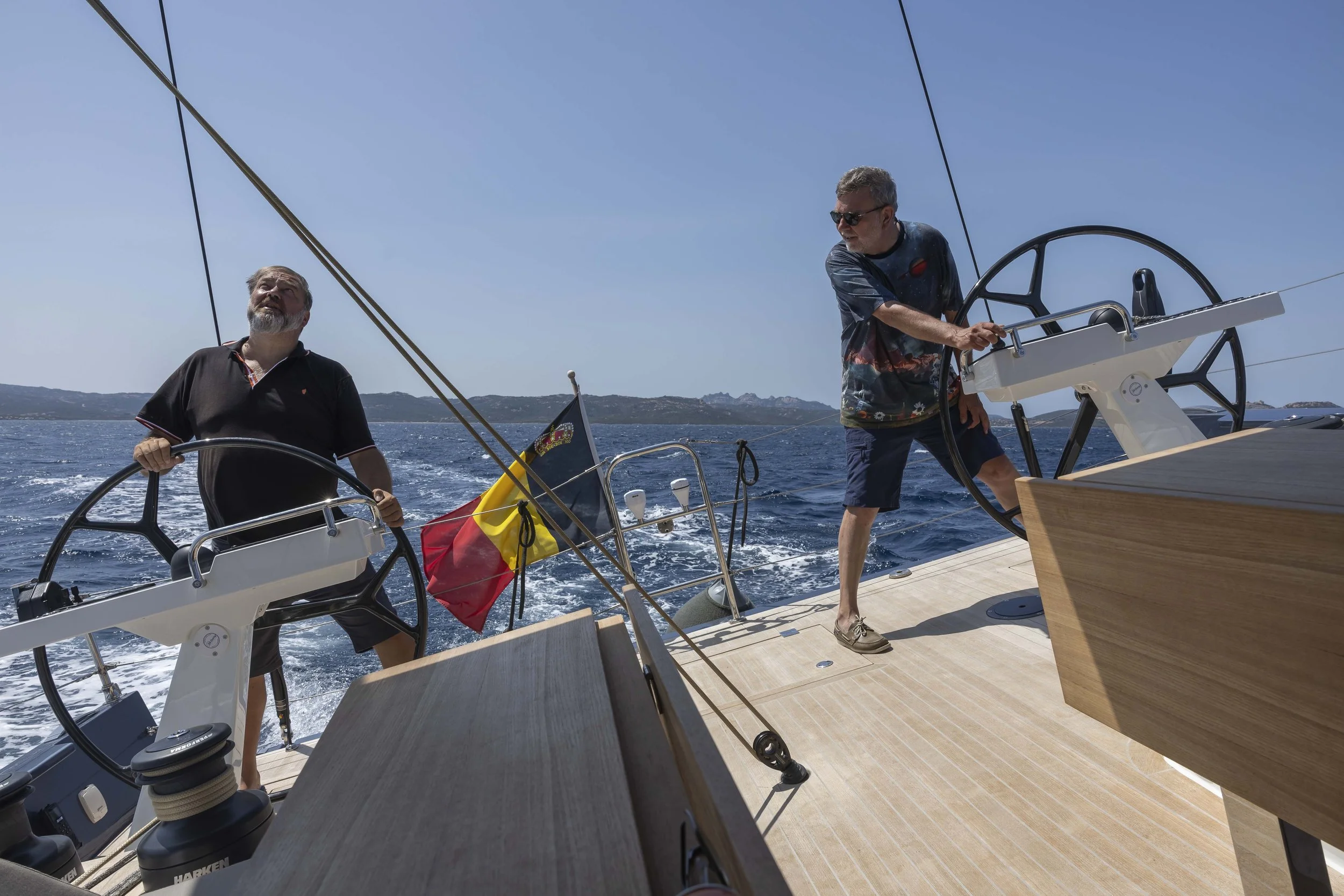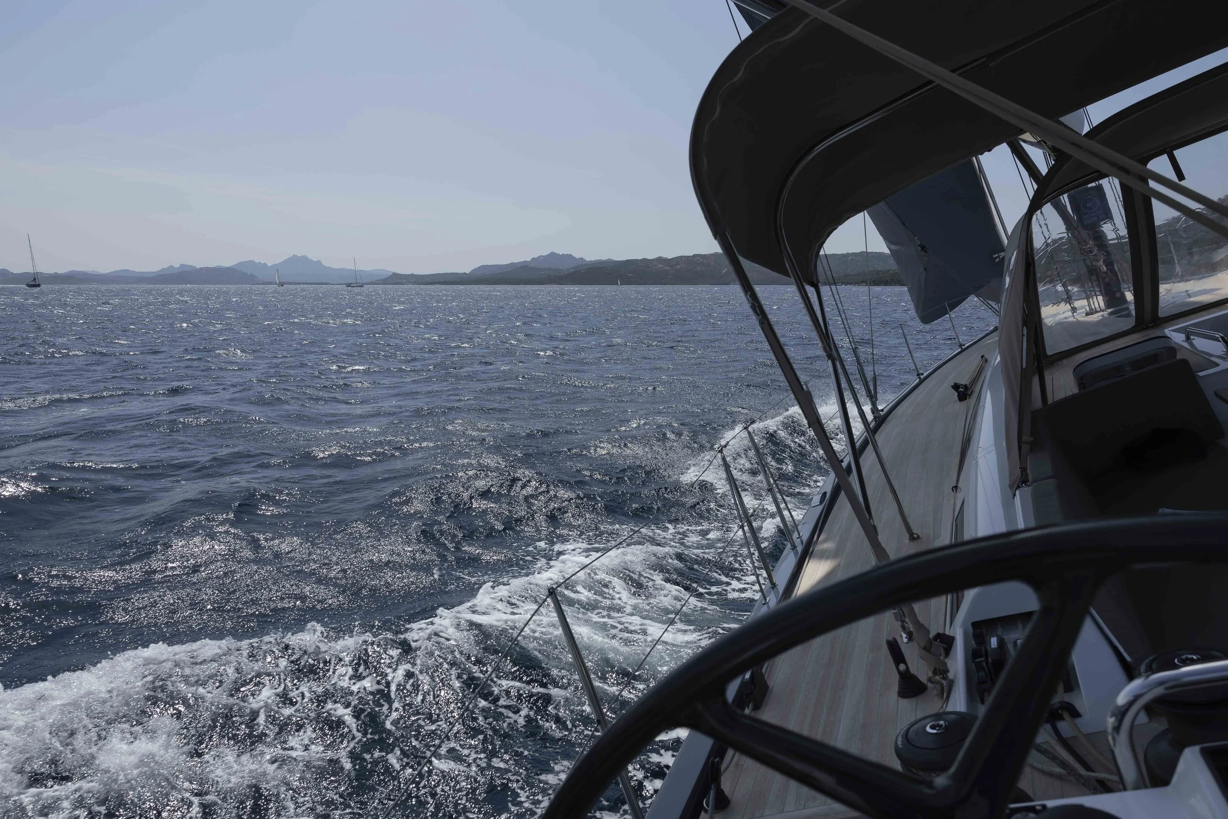 Bij het gijpen krijgen we de boot soms moeilijk terug onder controle. Met het grootzeil en de fok volledig open is de boot bij sterke windstoten duidelijk overpowered. Zo passeren we Isola Spargi, Isola La Maddalena en Isola Santo Stefano. We varen tenslotte om Isola Caprera heen, om Cala Portese binnen te varen.
