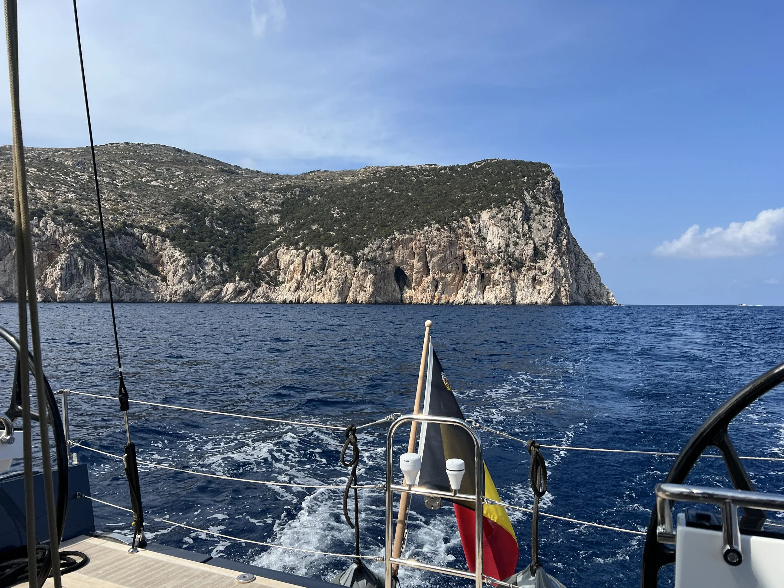 De tocht naar Capo Coda Cavallo verloopt vlot. Er is te weinig wind om op zeil te varen, zeker omdat we de fok niet kunnen gebruiken. Op aanraden van Horace houden we het grootzeil nog even hoog, in combinatie met de motor, “meer stabiliteit”, zegt hij. Maar omdat de wind uit het zuiden komt, weerom pal tegen onze vaarrichting in, helpt ons dat totaal niet. Integendeel. We strijken het grootzeil en leggen de 12 NM af op motor.