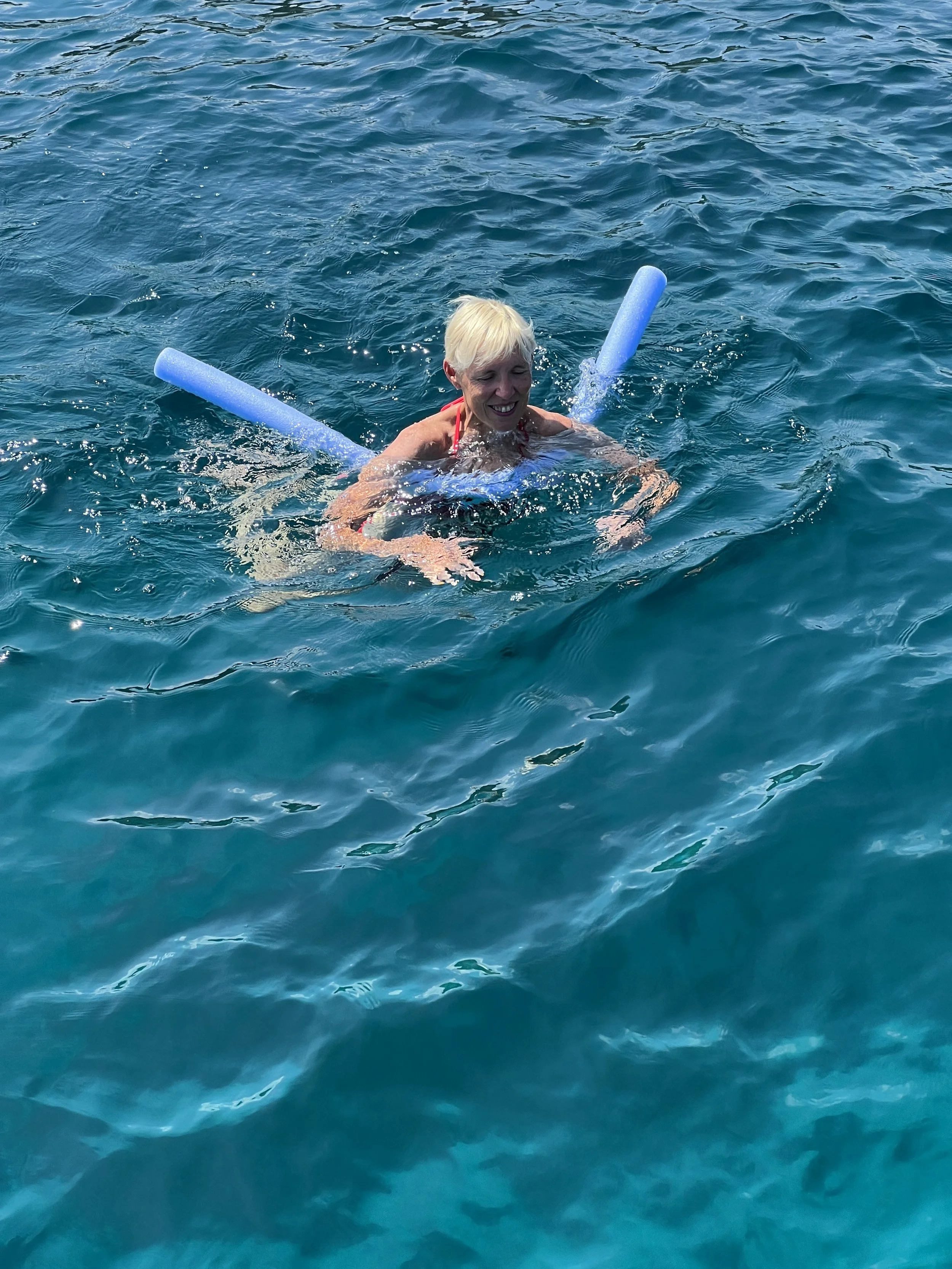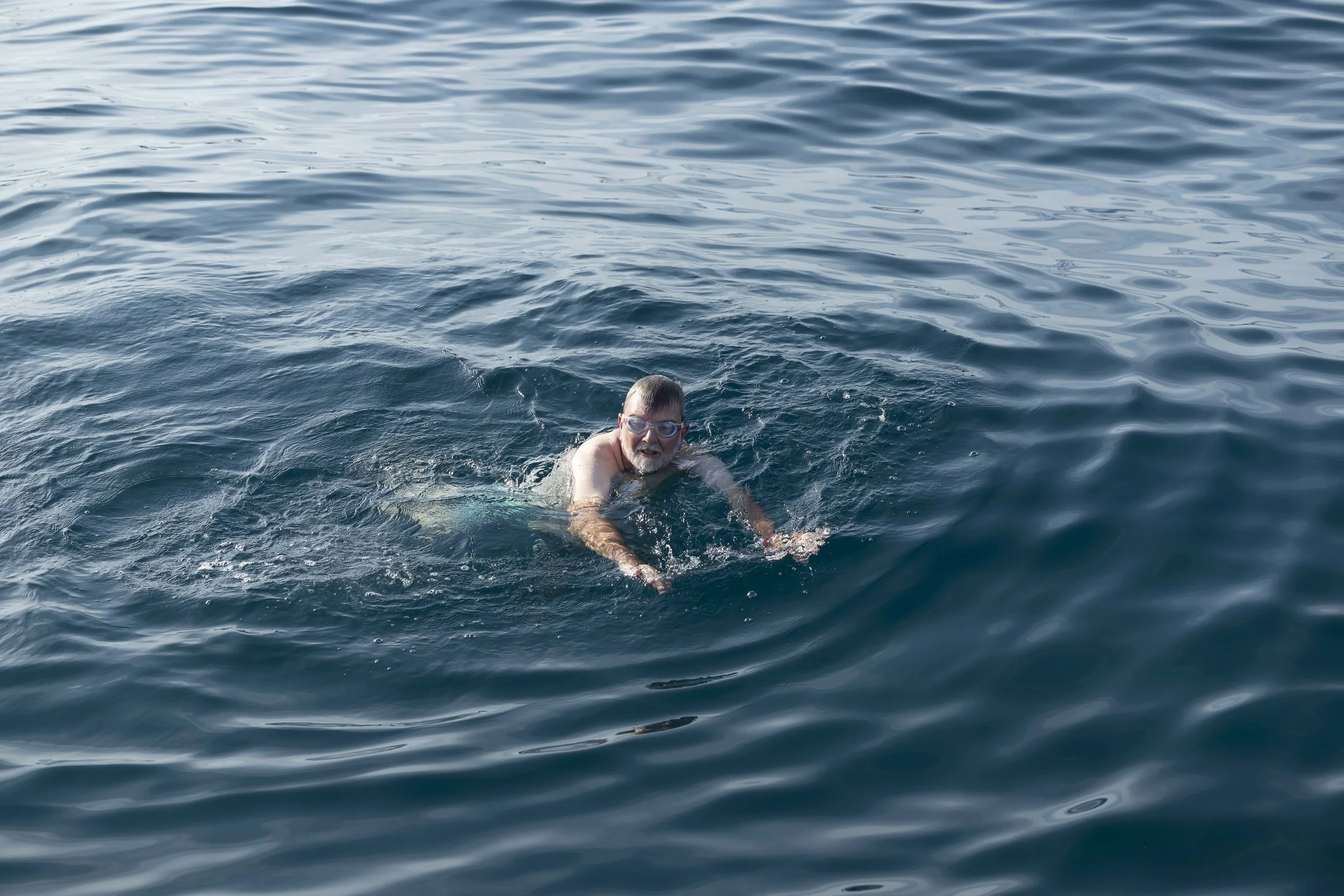 Hoewel we nog niet veel gegeten hebben vandaag, dwingt het warme weer ons prioritair in het water.