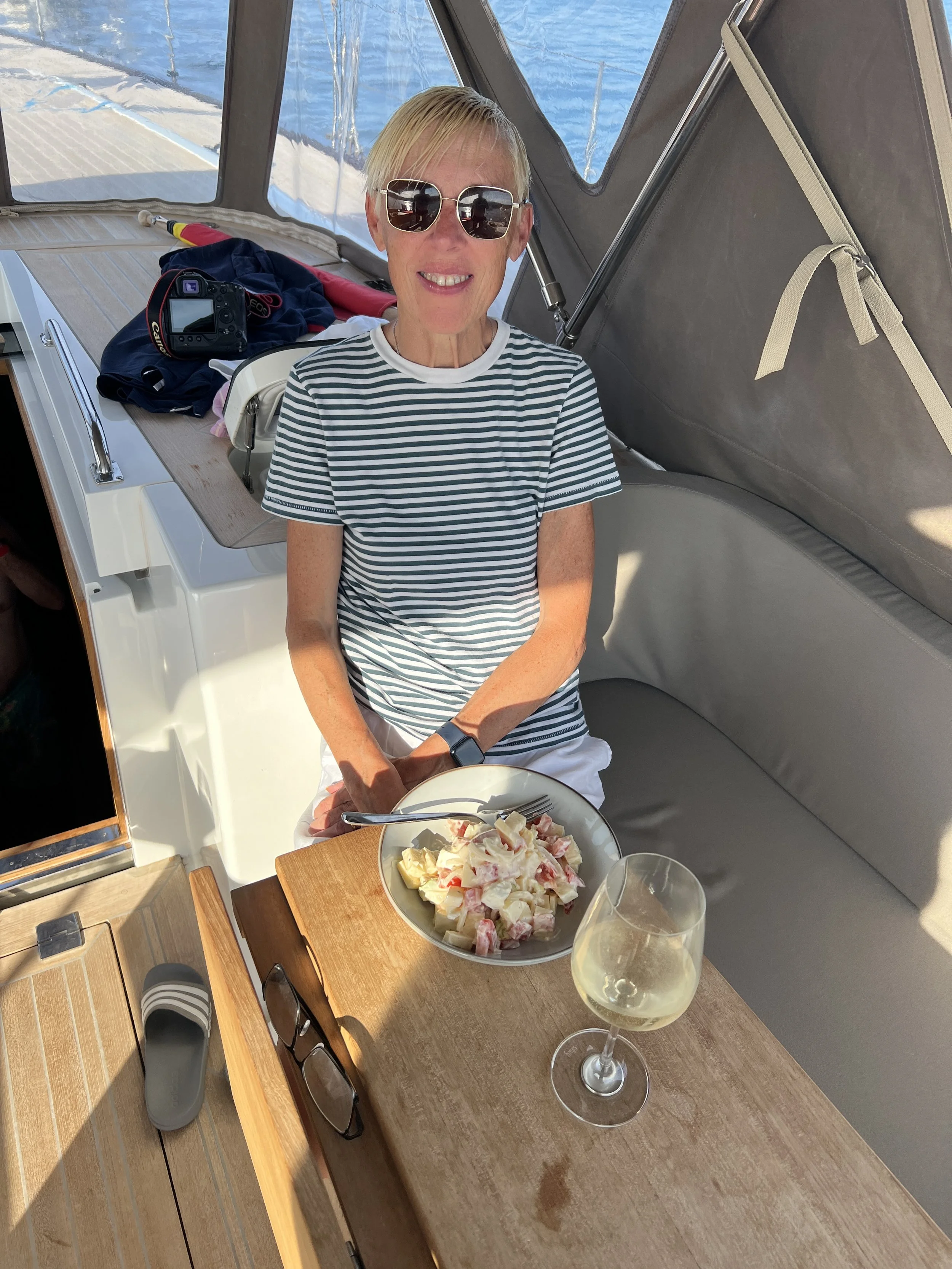 Daarna wordt een snelle, gezonde salade in elkaar geflanst, als een wel erg late lunch. Op een boot is eten altijd een climax.