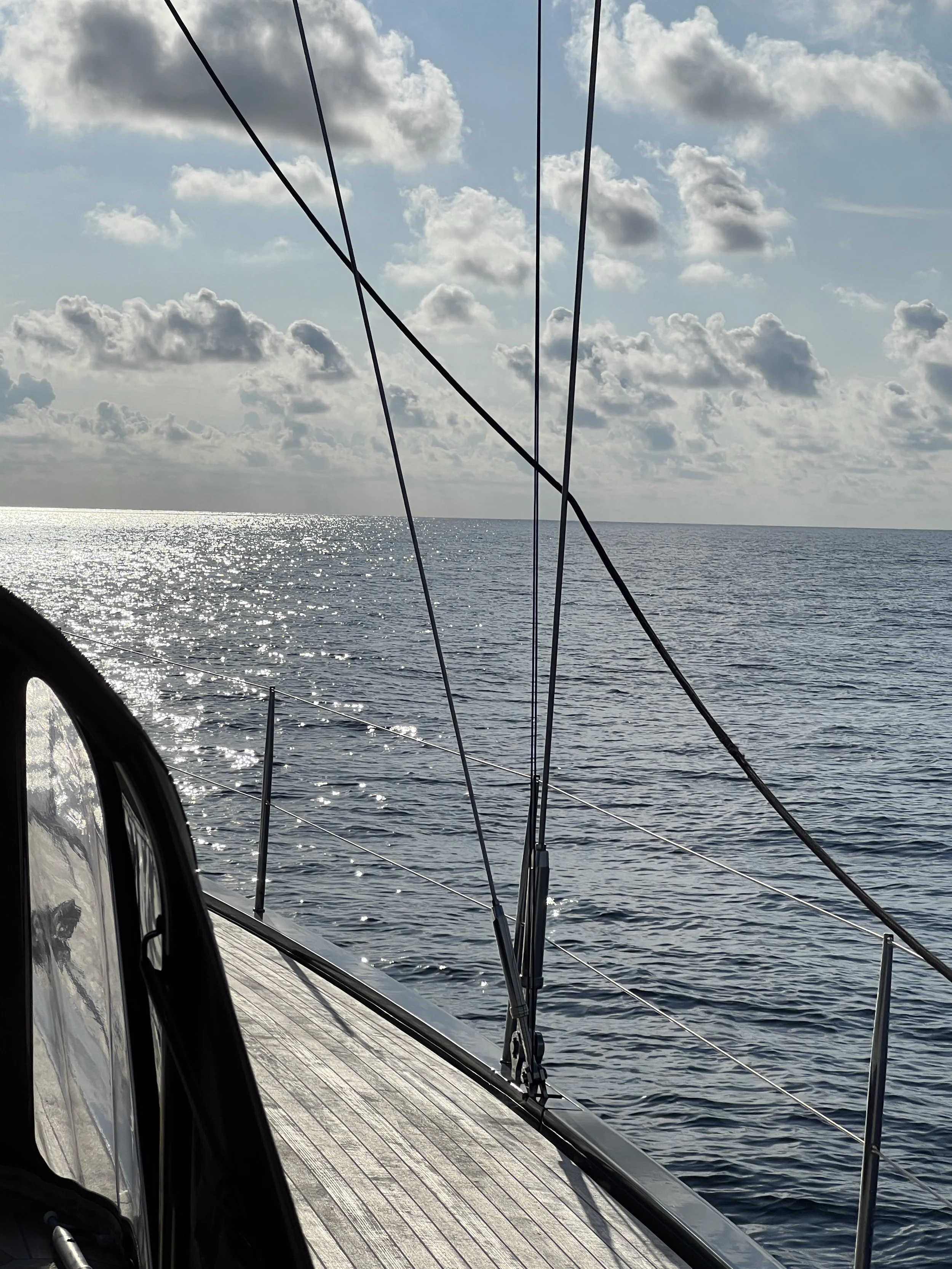 We hebben wat meer wind dan de dag voorheen, met 8 kn, en vooral op 90 graden, waardoor we de gennaker kunnen inzetten. We halen daarmee tot 5 kn, en besluiten dat een tijdje aan te houden. Elke zeemijl die we maken op zeil helpt ons diesel te sparen. Met de motor uit overvalt ons een meditatieve rust, nog versterkt door het kabbelende water tegen de romp van de boot.