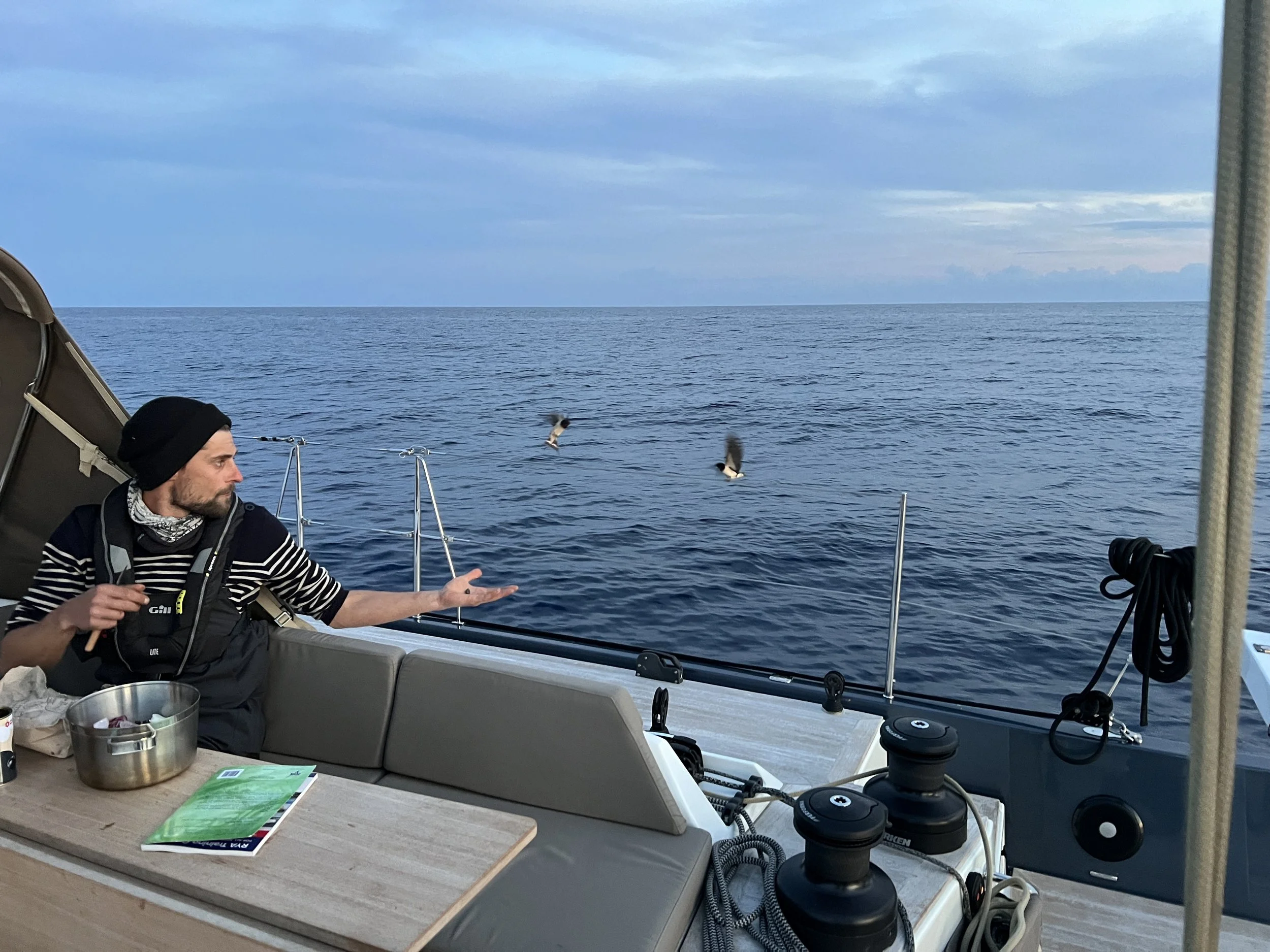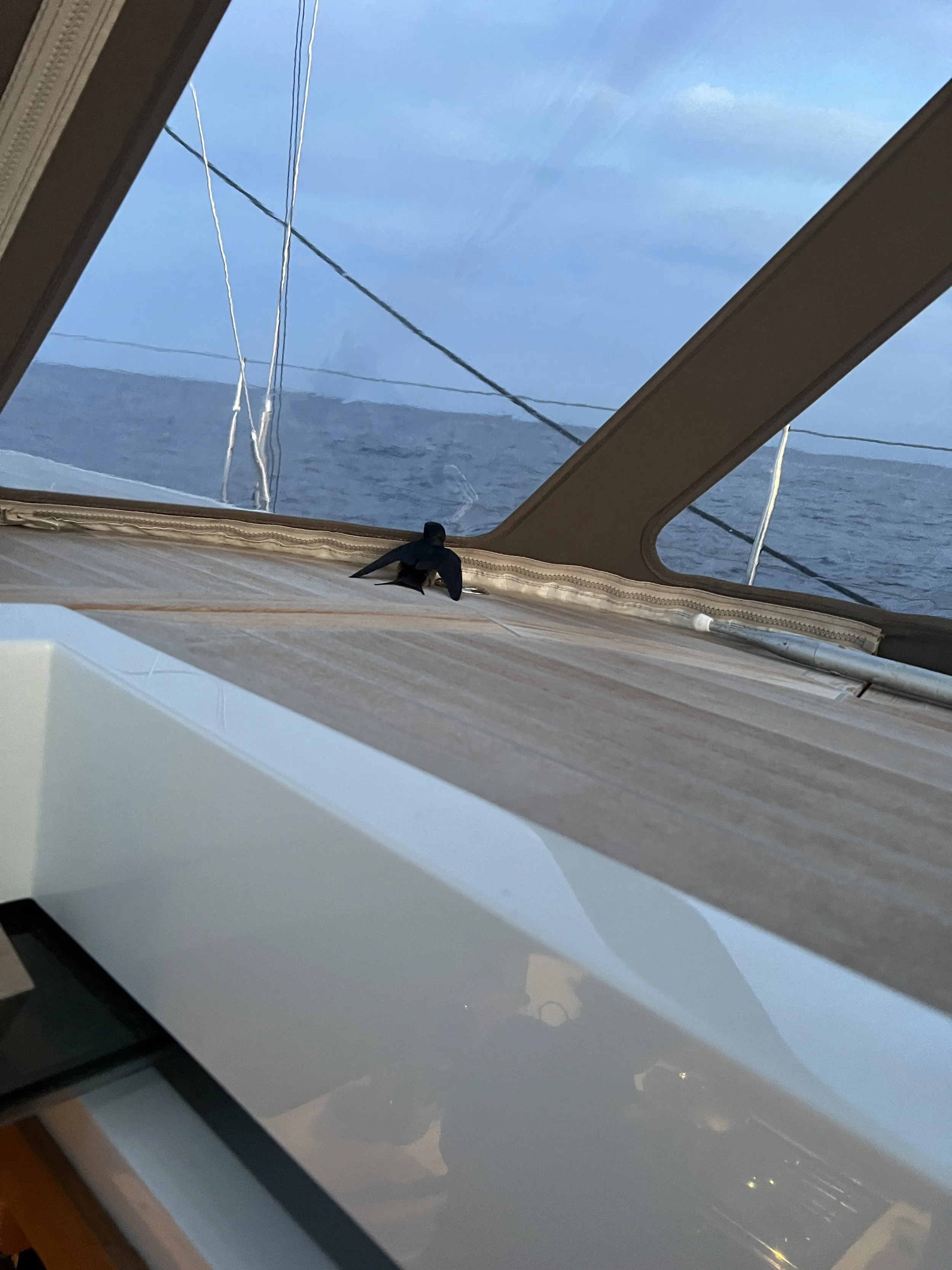 In de loop van de tweede dag, waarbij we in elke richting tenminste 100 Nm van de kust zijn verwijderd, krijgen we herhaalde malen bezoek van kleine vogels. Bezoekers die hier niet in hun element zijn, en de boot gebruiken om even uit te rusten, tenminste, als ze durven. Zo speelt Nils met een koppel zwaluwen.