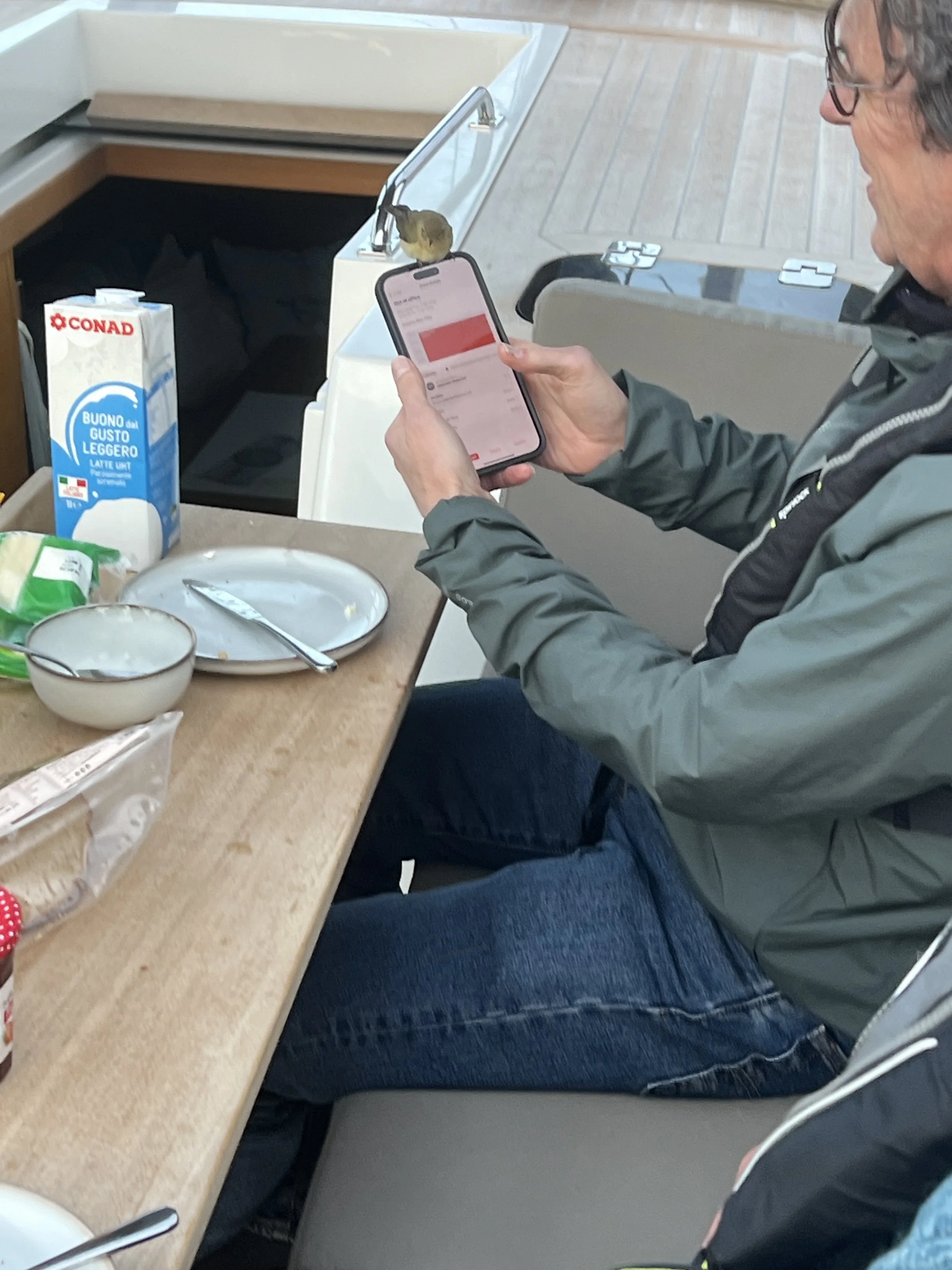 Rond de middag worden de kookkunsten van Nils verstoord door een dikke rookontwikkeling. De olijfolie adverteert dat ze niet graag zonder eitje op het vuur staat. Alle luiken open, en een tweede poging lukt wel.