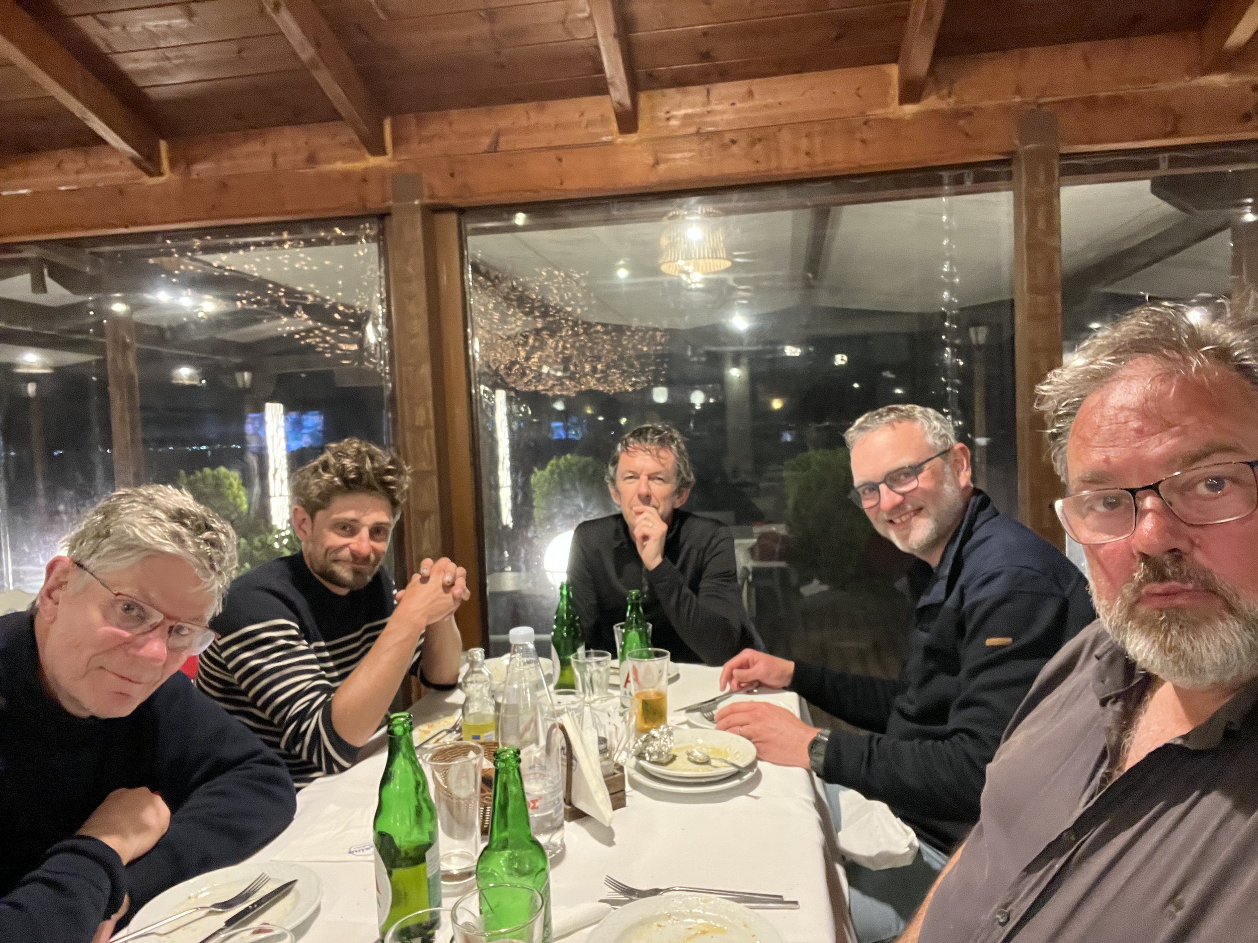 Wouter voorziet zijn gebruikelijke risotto, maar de venkel is onvindbaar. Merkwaardig, want zeker ingeladen, betaald en vervoerd. Courgette en champignons zijn de invallers. Tot overmaat van ramp heeft iemand zich vergrepen aan de pancetta. Het substituut dat daaruit voortvloeit doet niet beter dan het orgineel, maar we kunnen allen met een gevulde maag naar bed.