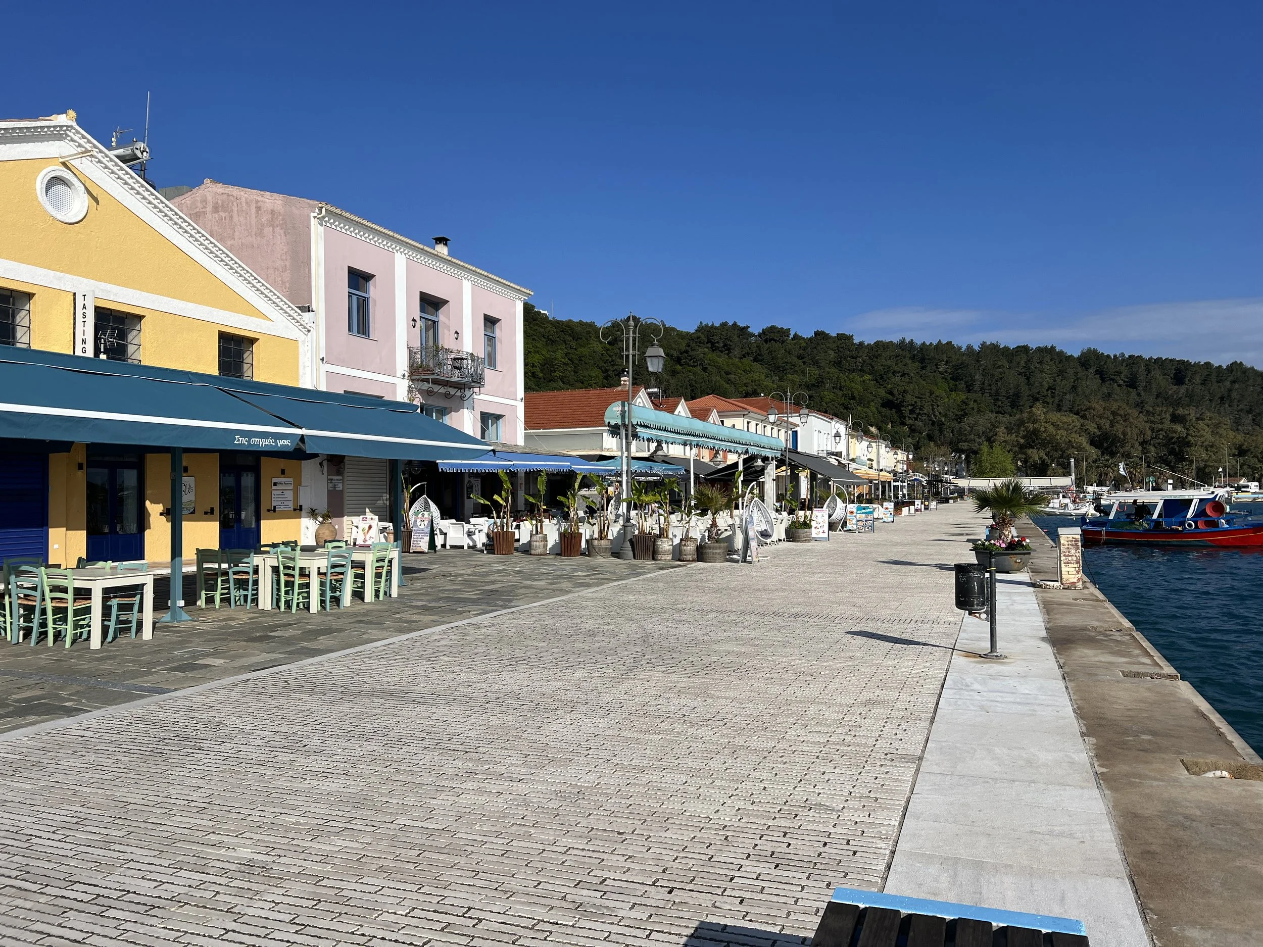 De aanblik van Katakolon in de ochtend is een beetje troosteloos. Minke Balaena ligt eenzaam in een quasi lege haven, zoals de havenpolitie eerder al had aangegeven.