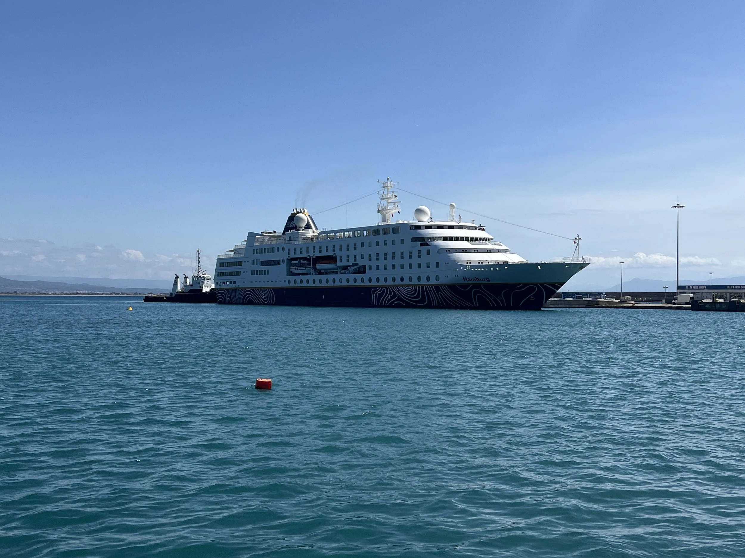 Rond het middaguur verschijnt het cruise schip in de haven, precies zoals aangegeven door de havenpolitie. Katakolon is een stopplaats voor cruises omwille van het nabijgelegen Olympia, een archeologische site waar de Oud-Griekse Olympische spelen plaatsvonden. De grote massa passagiers blijft echter uit. Twee bussen pikken enkele verdwaalde toeristen op. Het treintje komt niet in beweging.