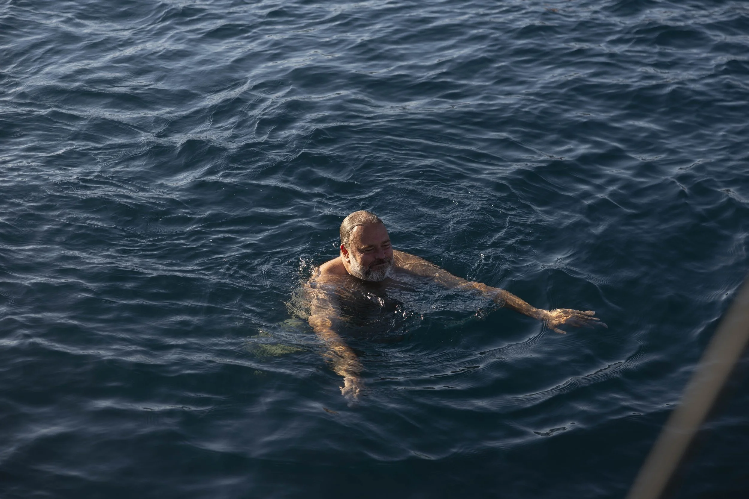 De temperatuur van het water is bijna 23 °C, en iedereen zwemt, met één uitzondering. Een duik in het koele water is een weldaad, na een lange, vermoeiende tocht met de boot.