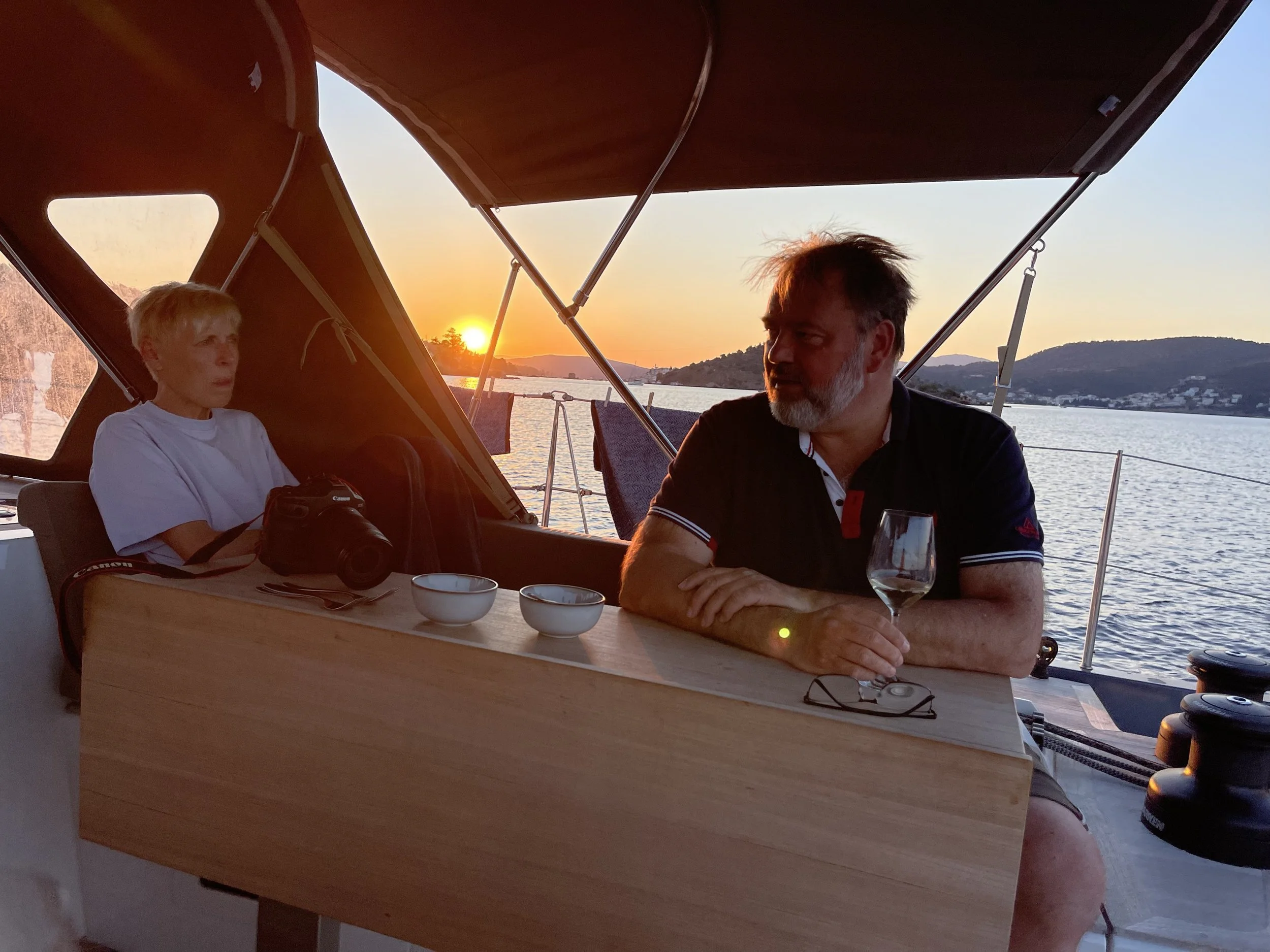 Achteraf leren we dat de wind-apps net op die plaats een erg chaotisch windbeeld aangeven, vermoedelijk wegens de invloed van de landtong van Attica op de noorderwind. Een goede leerschool voor helpende handen Ingrid en Frank, maar niet erg leuk als een eerste ervaring.