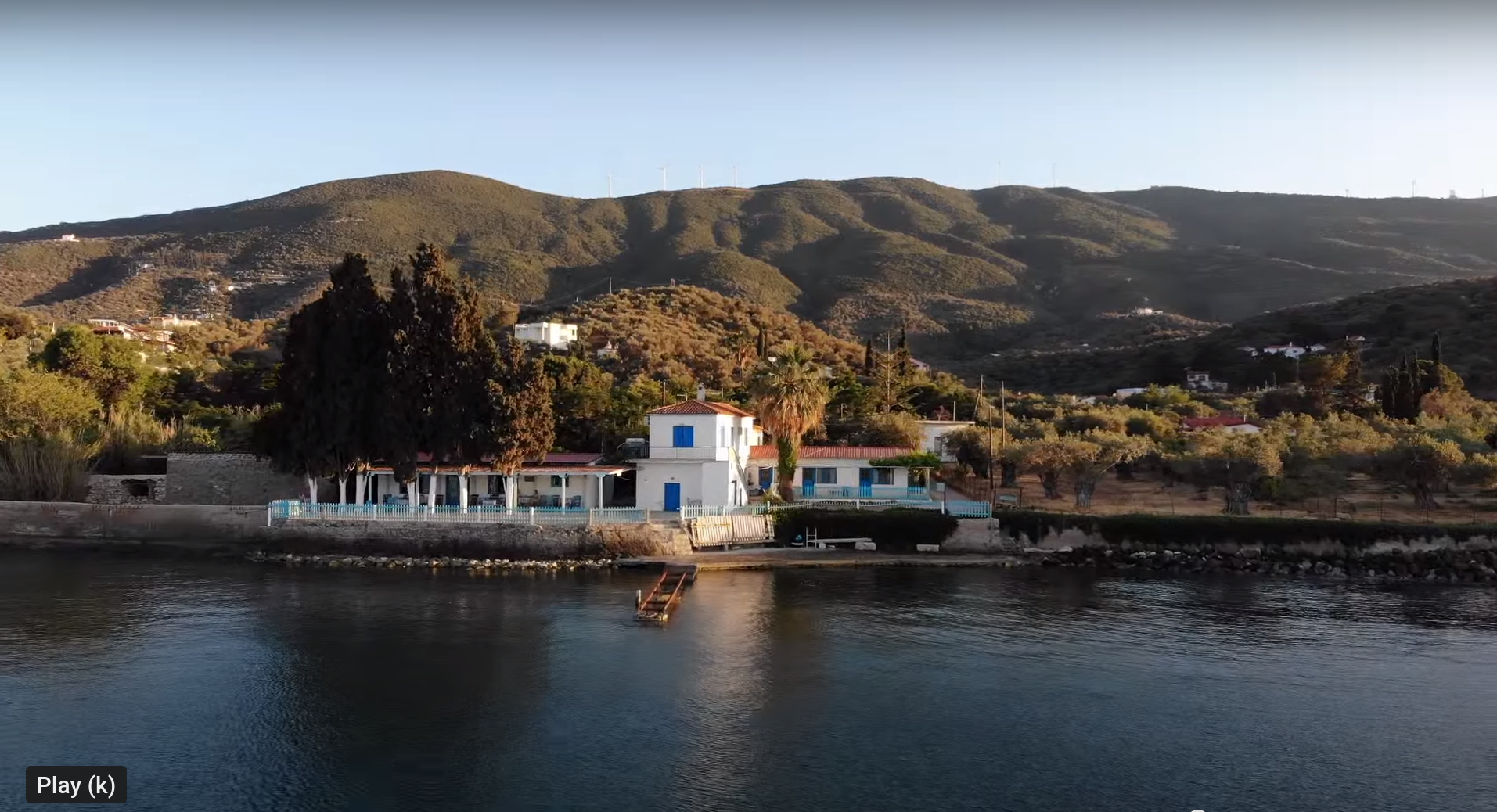 Het typisch Griekse gebouw aan de oever dat eerder al door de drone werd vastgelegd, blijkt een restaurant te zijn, en open op de koop toe.
