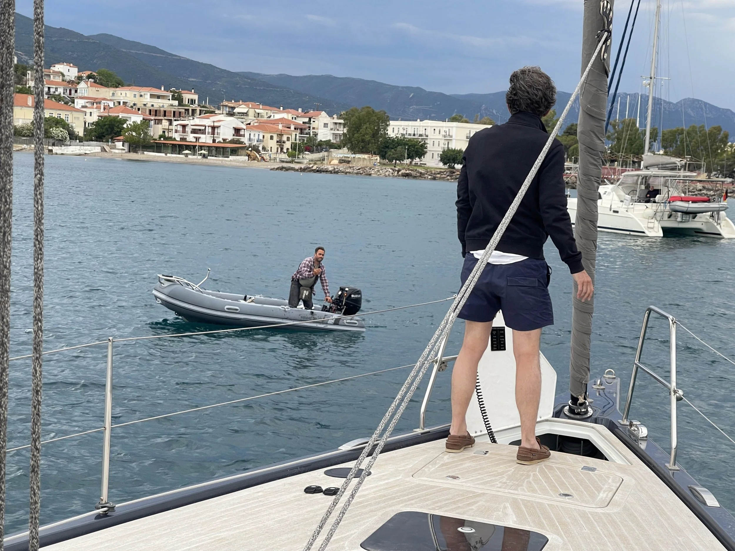 Ook daar lukt het niet onmiddellijk grip te krijgen met het anker. Tot ene Banos met een rib komt aanvaren en zijn hulp aanbiedt. We moeten het anker droppen boven zand, wat je kan zien aan de kleur van het water. Aan het einde van het neerlaten van de ankerketting moeten we de motor kort en krachtig in achteruit zetten. Zo gezegd, zo gedaan. Met een schok komt de boot tot stilstand. Zo zit het anker zeker vast.