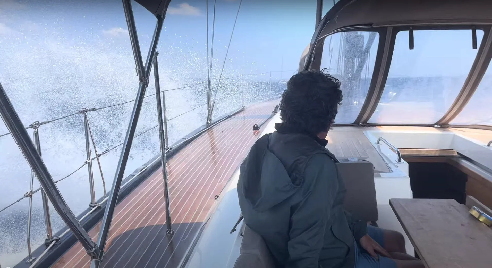 Wouter klautert naar het voordek om het dicht te doen, met reddingsvest uiteraard. Voor hij terug op het achterdek is, staat het luik alweer open. Frank krijgt na veel discussie toelating om het ook te proberen, en zich meteen in de master cabin te laten zakken en het luik te sluiten. Zo gezegd, zo gedaan.