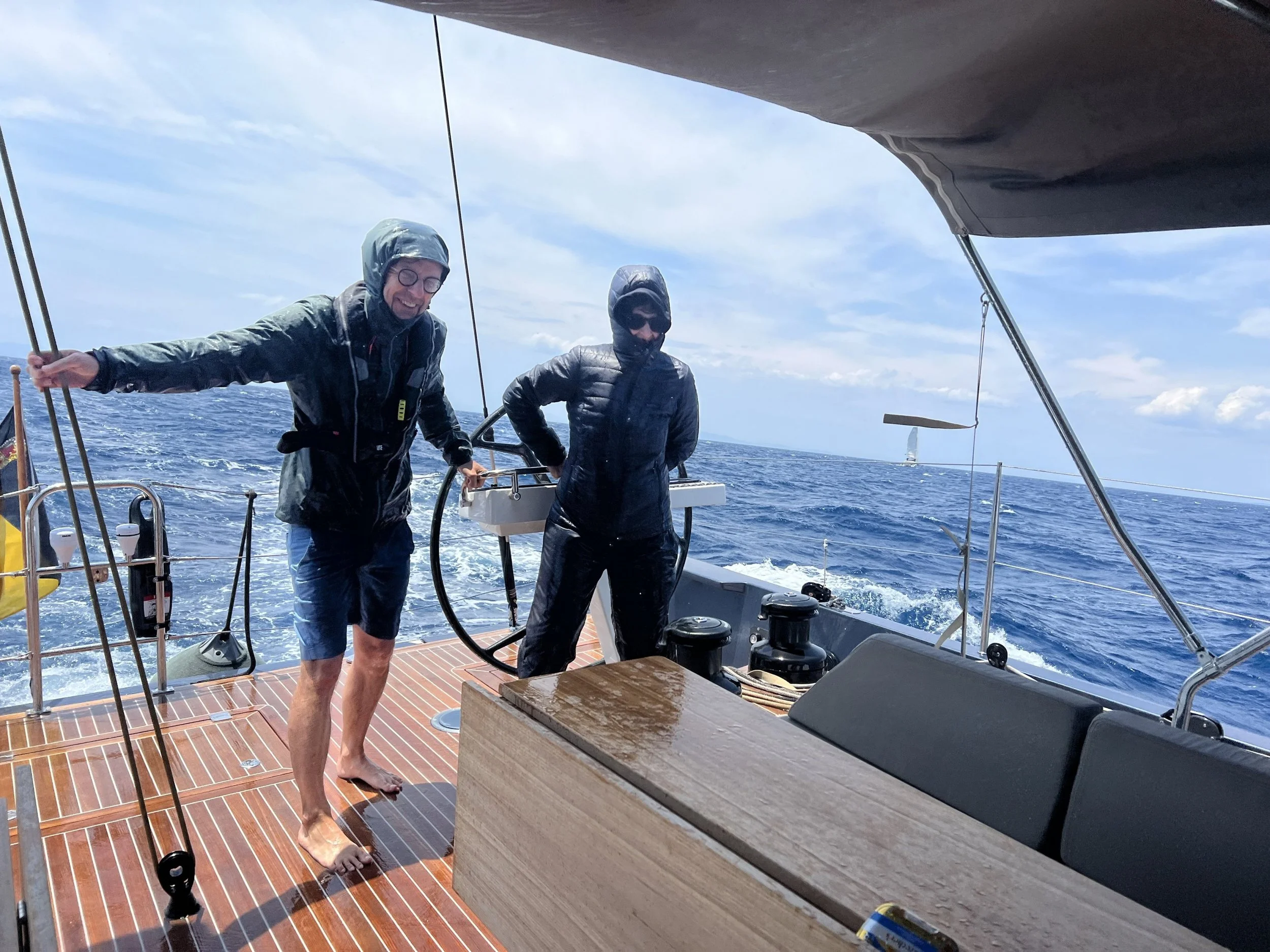 Uren verstrijken. Geen van de leden van het team ervaart zeeziekte. Ook Ann niet. De golven worden gelukkig niet hoger dan 1 meter, maar de wind neemt toe tot 33 kn, heads on, waardoor de bootsnelheid, met de motor op 2000 toeren, beperkt wordt tot 5 kn. Met regelmaat passeert er een muur van opspattend zeewater over het dek. Iedereen is ondertussen nat tot op het ondergoed, behalve Ingrid, die tot driemaal toe een defensievere outfit aantrok.
