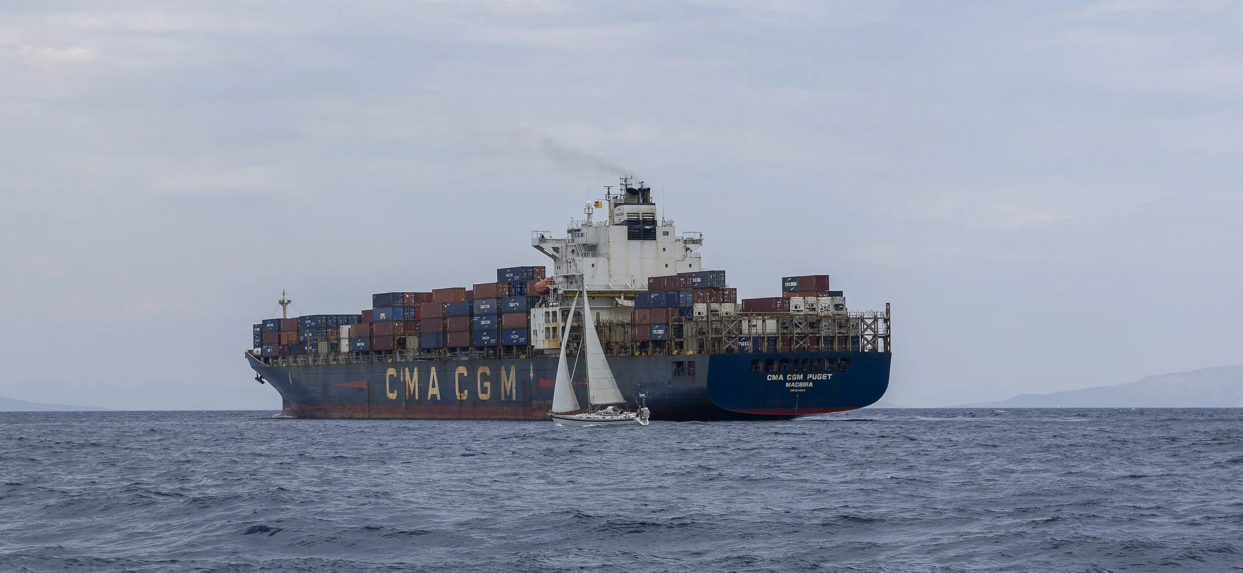 Aan de andere zijde van het containerschip, buiten ons gezichtsveld, neemt een derde zeilboot zijn voorrang, ondanks gefrusteerd getoeter van het containerschip.