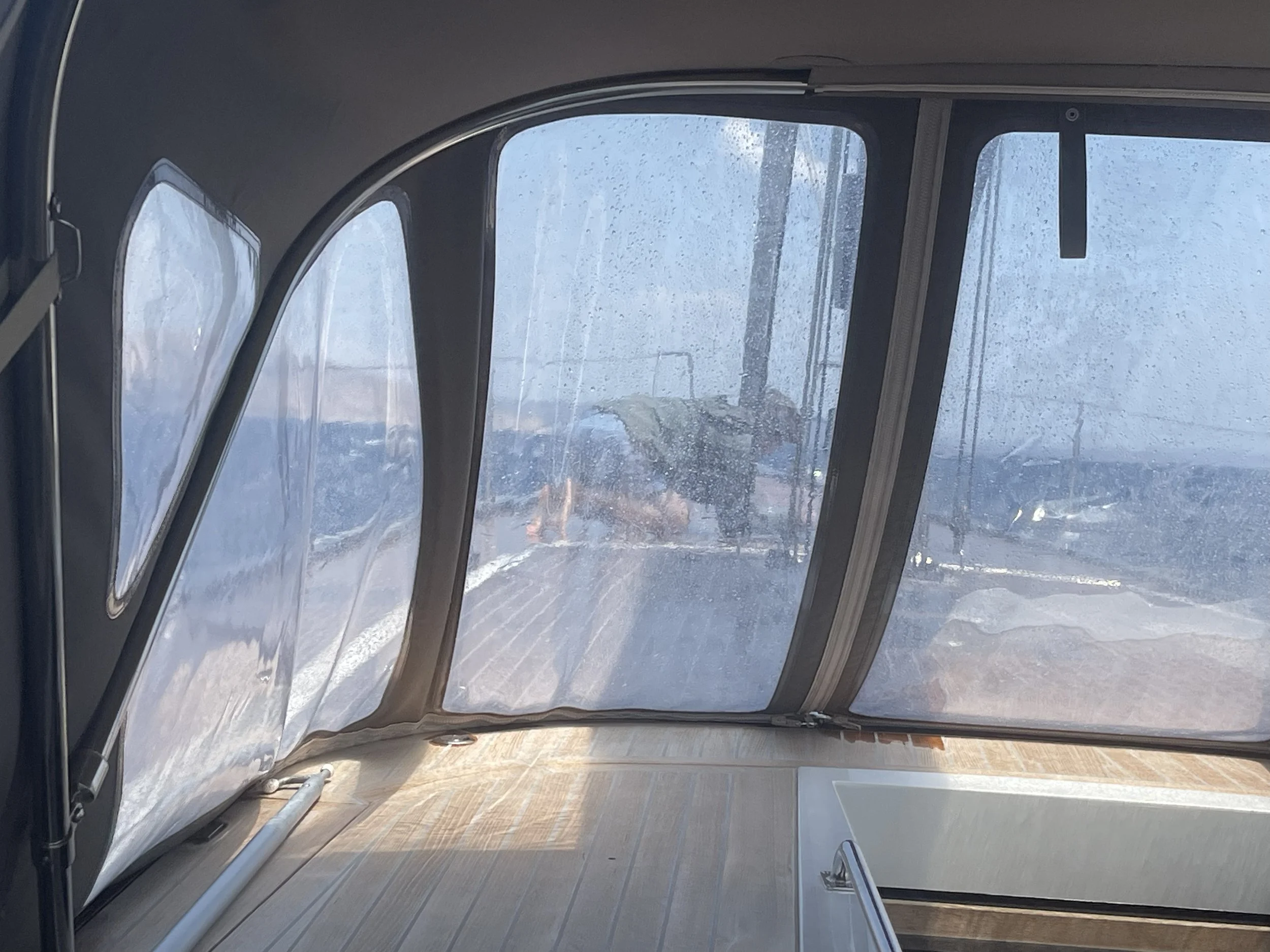 Door het stampen van de boot is één van de luiken van de master cabin open gegaan. Wel dicht, maar niet afgesloten, blijkbaar. Met lede ogen zien we regelmatig een halve emmer zeewater naar binnen gaan.