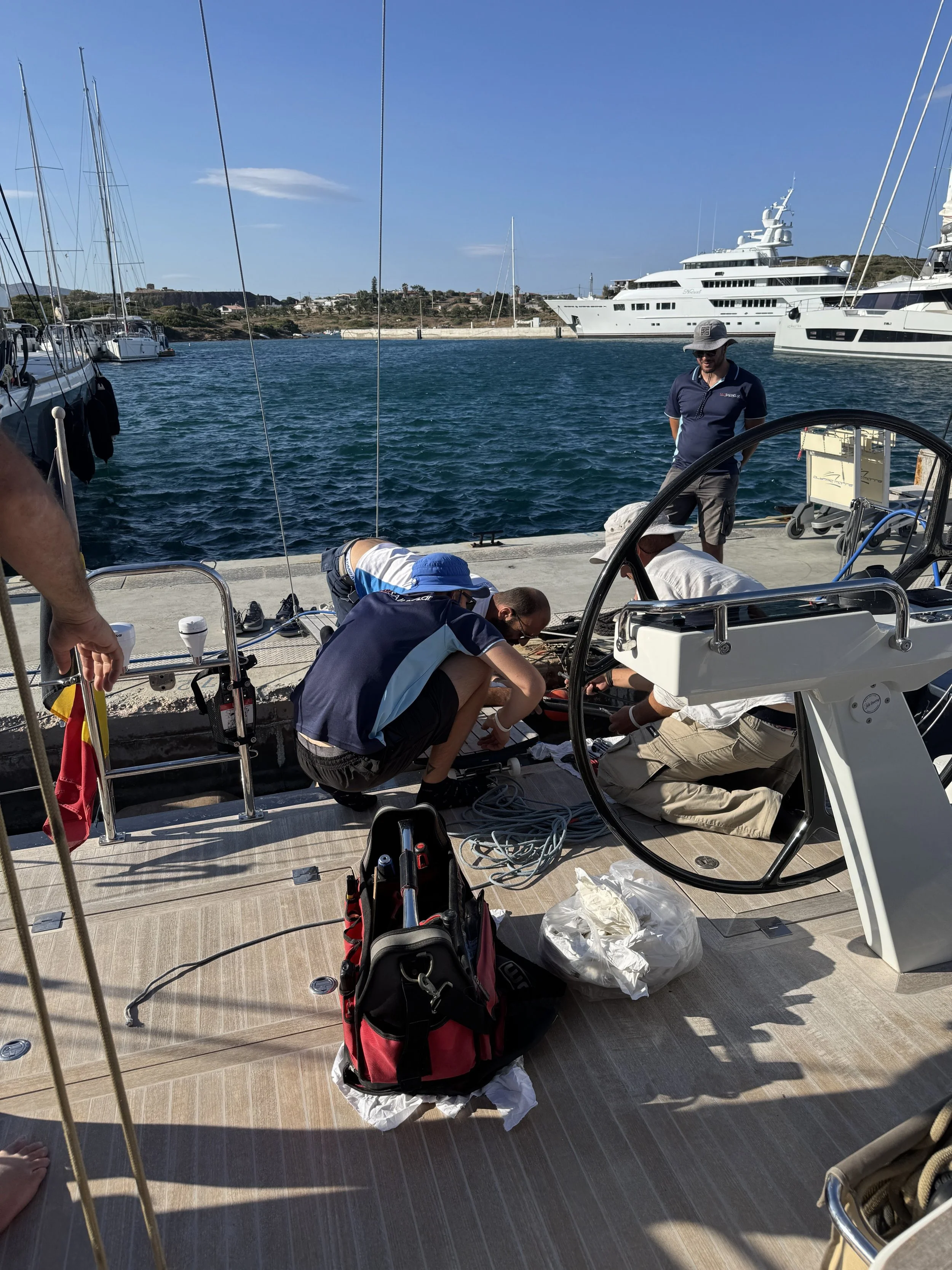 In de late namiddag komt de ploeg van Fast Sailing de defecte zuiger demonteren, voor een spoedige reparatie.