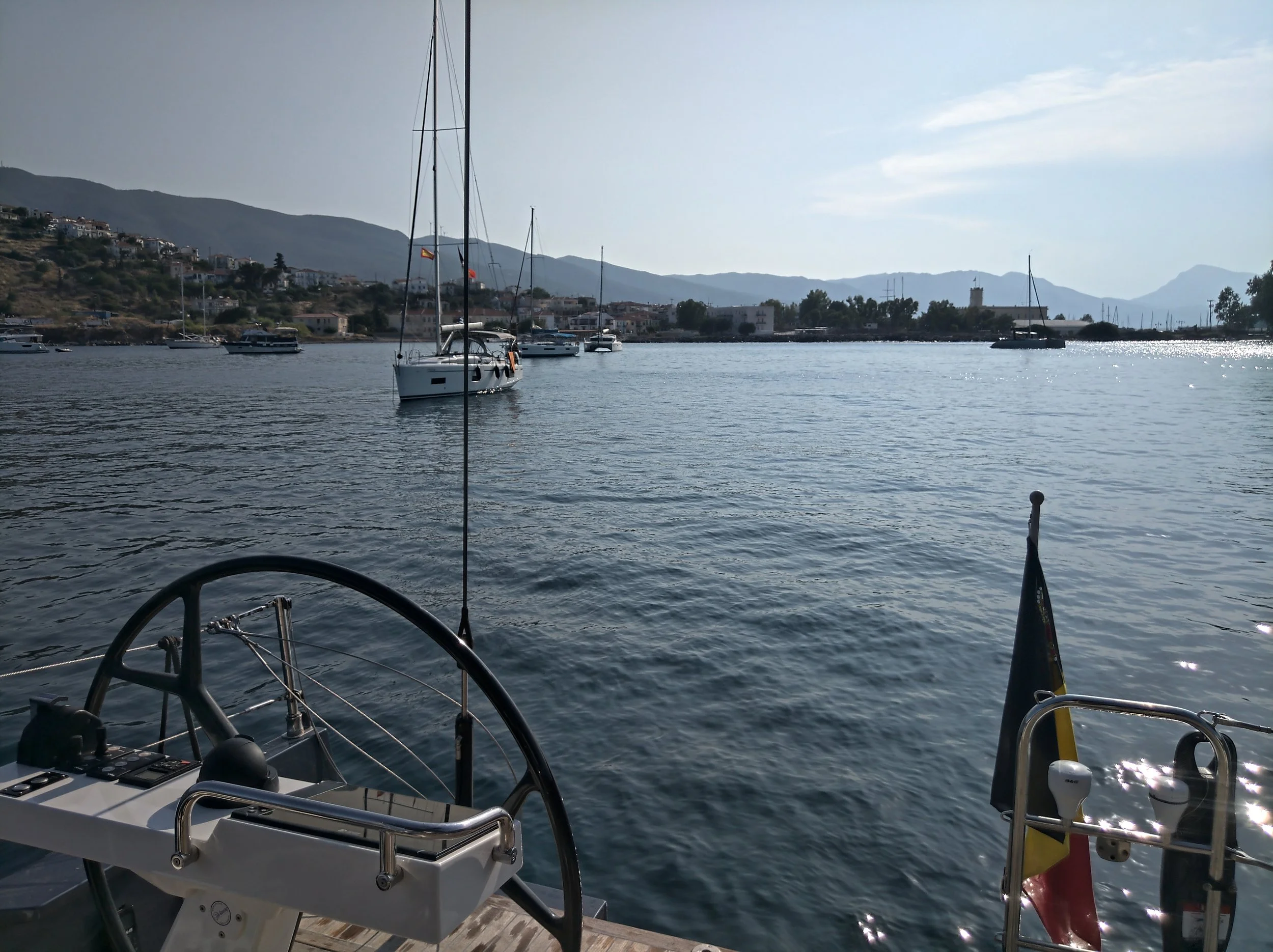 We varen uit, en merken pas buiten de haven dat de GPS niet werkt. Tenminste, hij start goed op, maar schakelt zichzelf na korte tijd weer uit. Steeds opnieuw. Ook zonder GPS wensen we ons niet op Griekse wateren te begeven. Terug de haven in dus. We roepen de havenmeester op en vragen assistentie voor het aanmeren. On-board ditmaal, want het waait nog een stuk harder dan die laatste keer ‘s nachts.