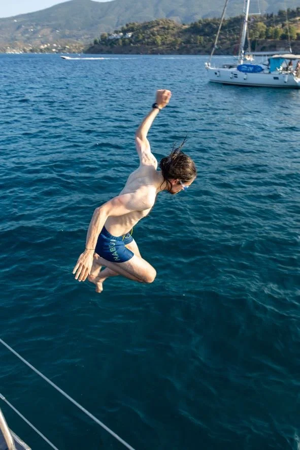 Wanneer we de punt van Attica ver genoeg achter ons hebben, je weet wel, met de halve poging van Dronen van Wind en Water, waait het nog steeds boven de 20 kn, halve wind, tot lichtjes ruim. We beslissen enkel de fok te hijsen, en boeken een aardig resultaat. Bij 25 kn wind halen we 8 kn bootsnelheid, bij pieken tot boven de 30 kn wordt dat vlot 9 kn.