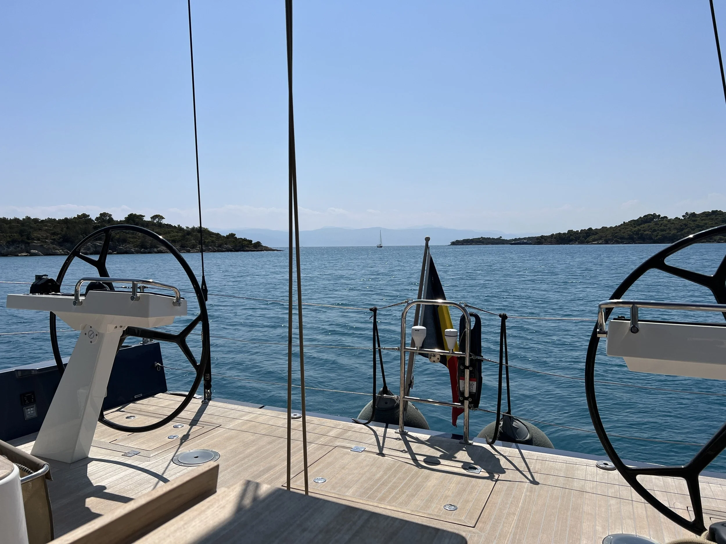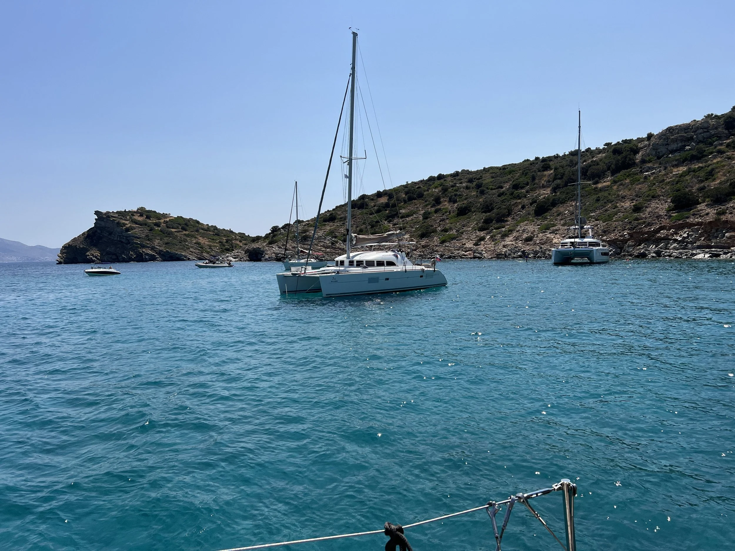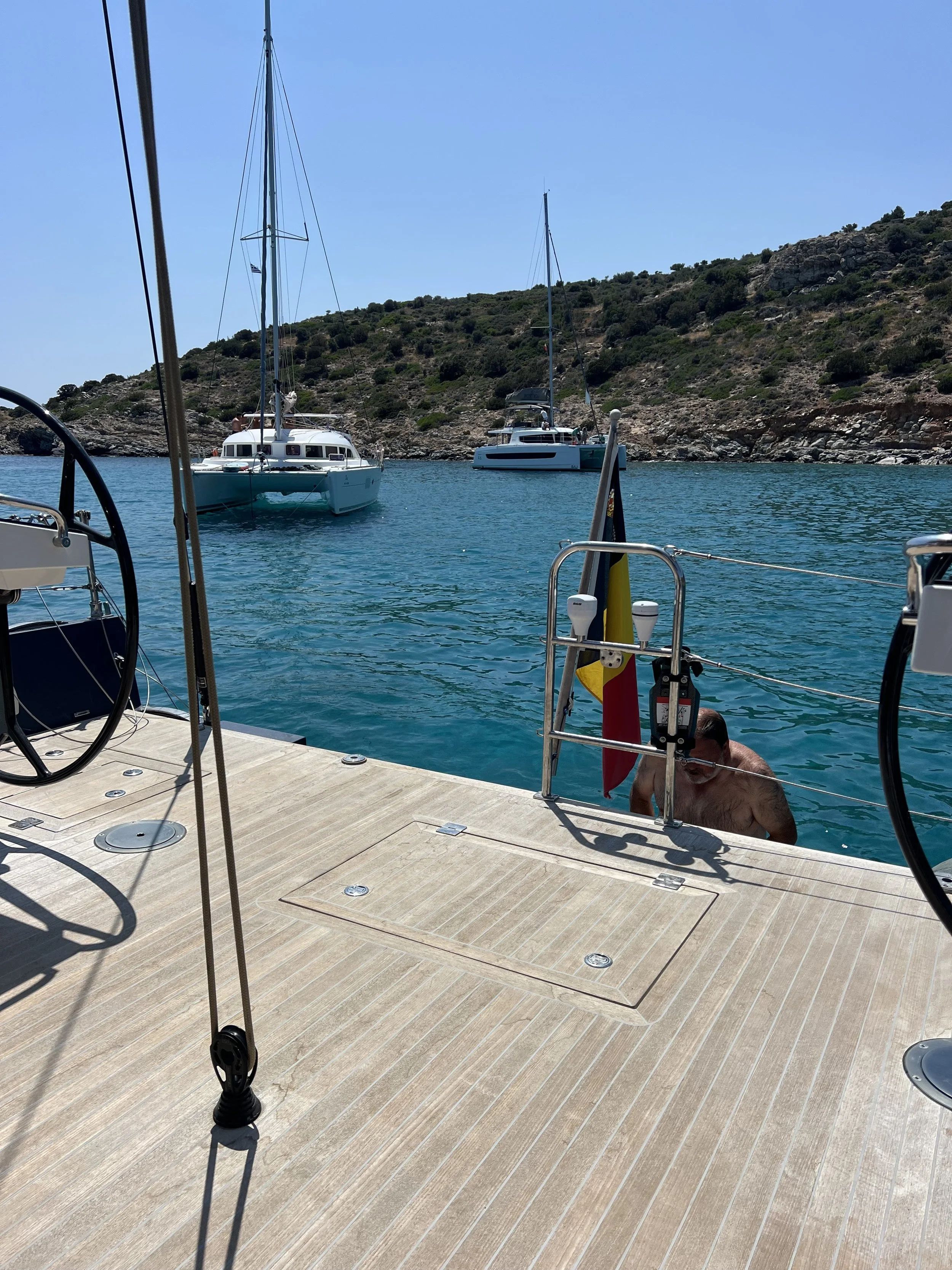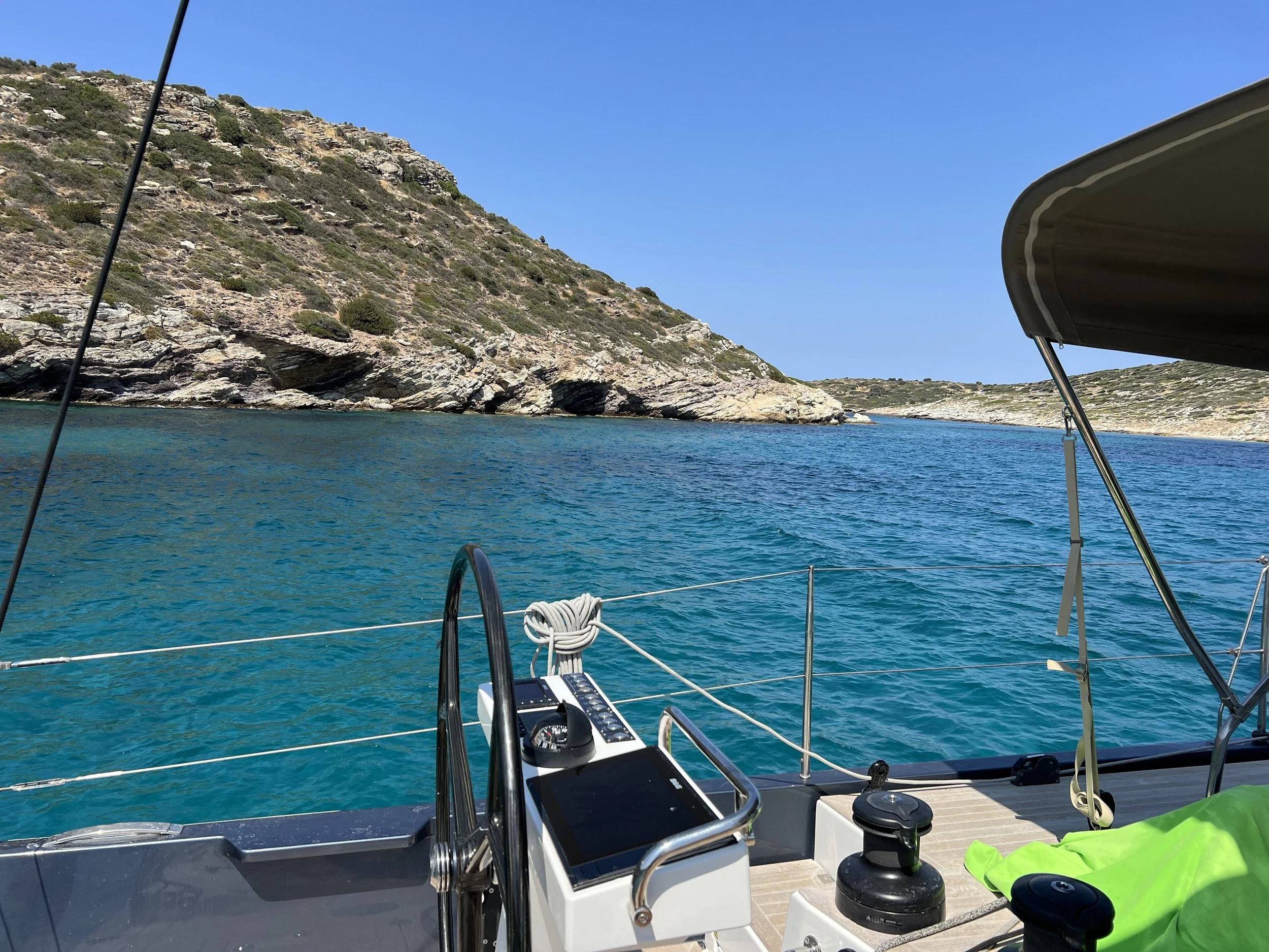 We zetten koers naar het zuidwesten, met het plan ergens te ankeren (en te zwemmen) voor we aldaar aanmeren. Trouwe lezers weten ondertussen dat we dan cape Skyli passeren. En ook ditmaal blijkt er een plaatsje te zijn. Met een spiksplinternieuw relais voor het anker lukt het nu eindelijk dat plaatsje ook effectief in te nemen. Het ankeren loopt als vanzelf.