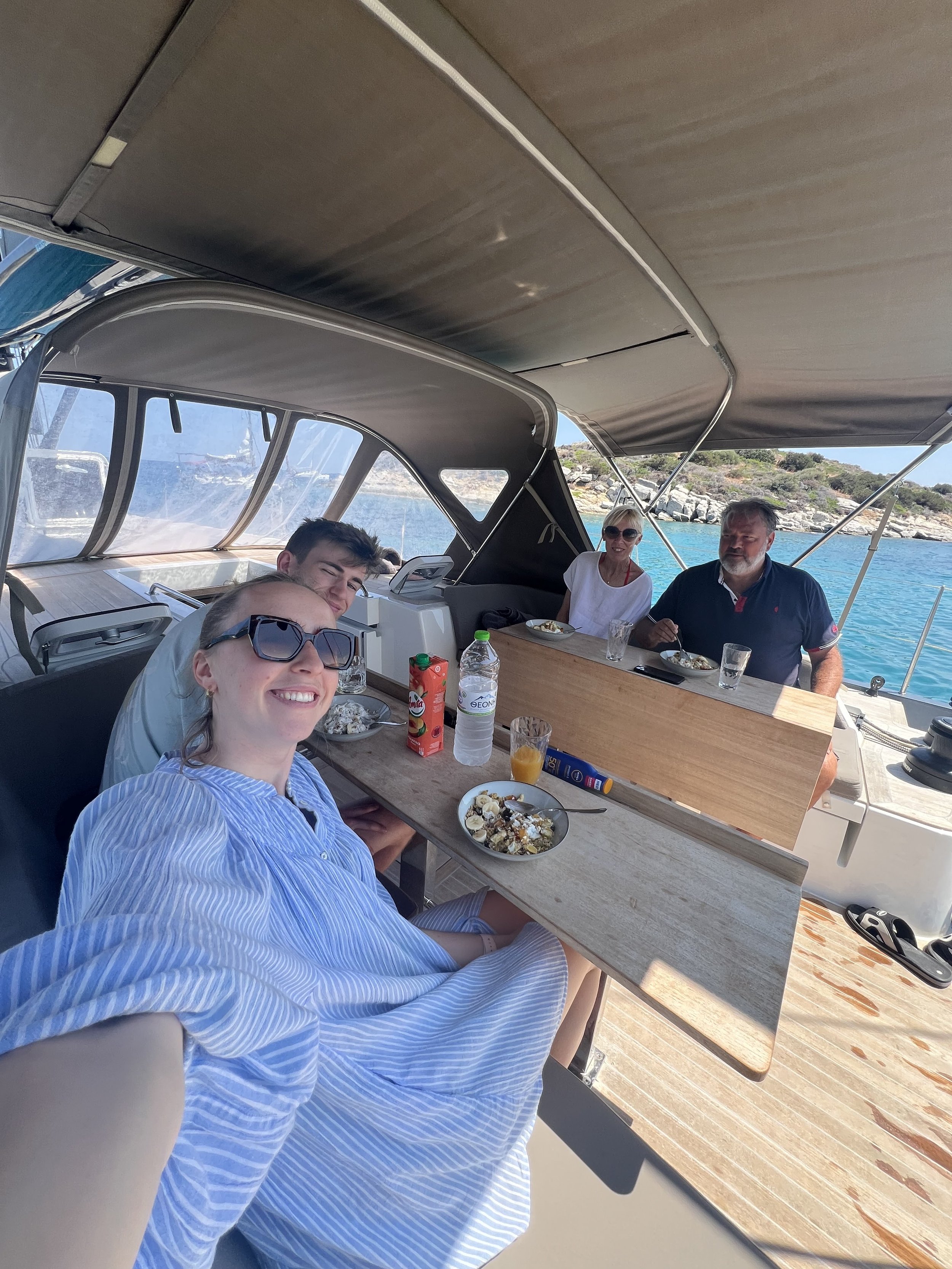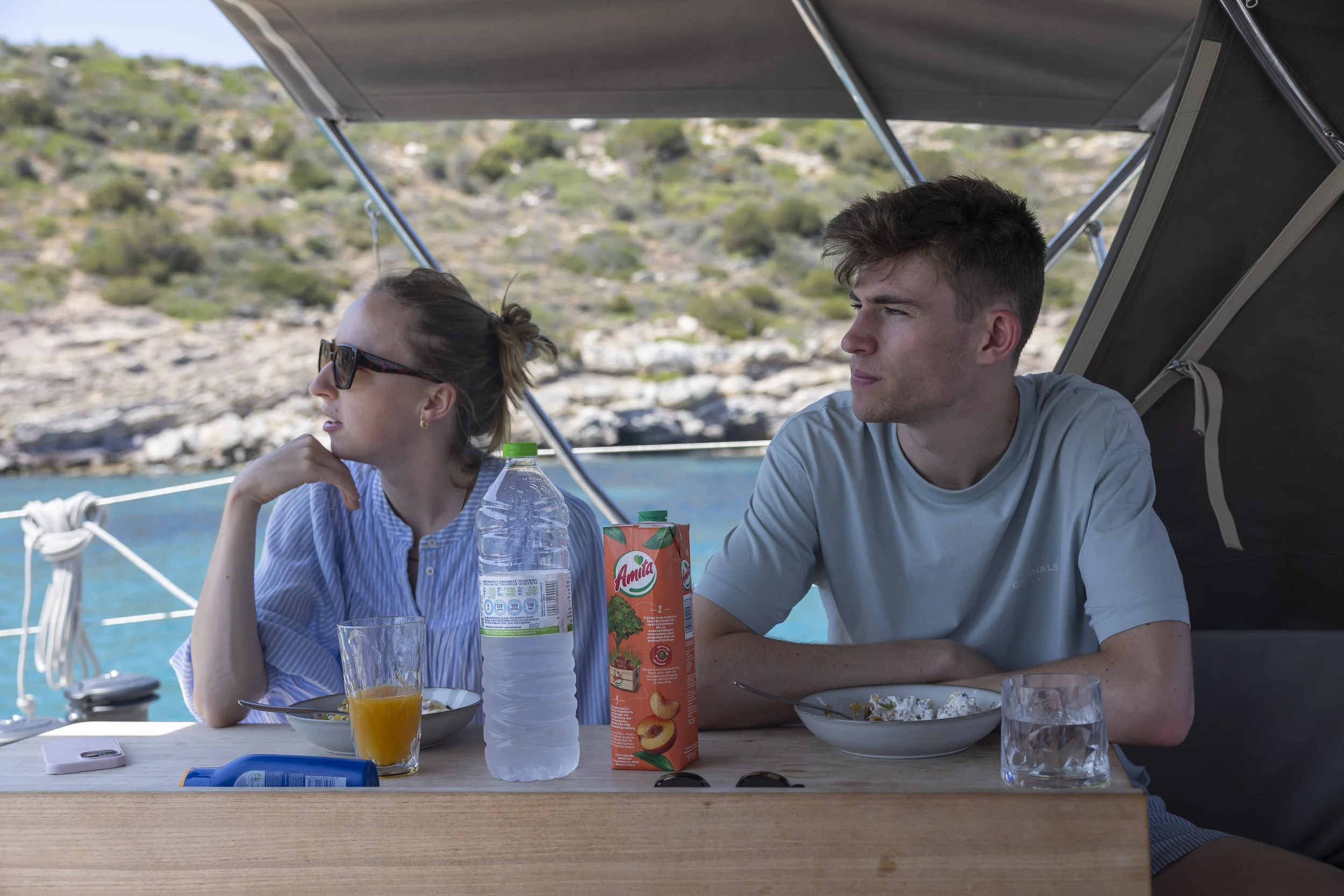 De nacht van zaterdag op zondag is het full house, met zes slapers op de boot. Zondagochtend verloopt gemoedelijk, met nogmaals een ontbijtje bij Serenita.