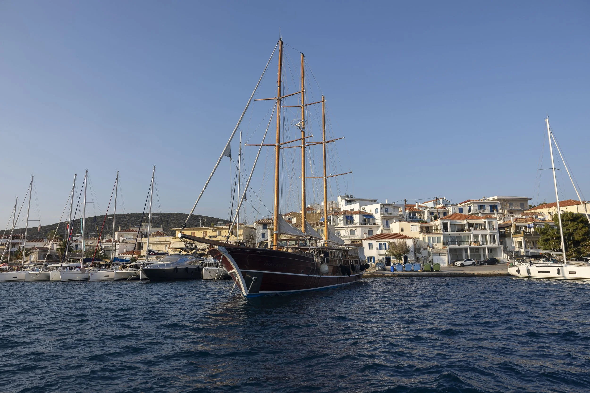 We zeilen verder tot in Ermioni, waar we bij het binnenvaren een prachtige driemaster passeren.