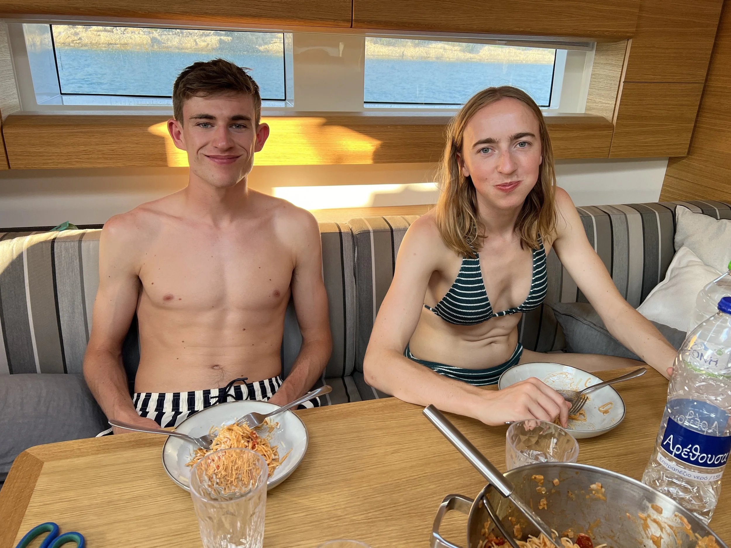Lore en Mats verzorgen het avondmaal. We krijgen een lekkere pasta pesto gepresenteerd.