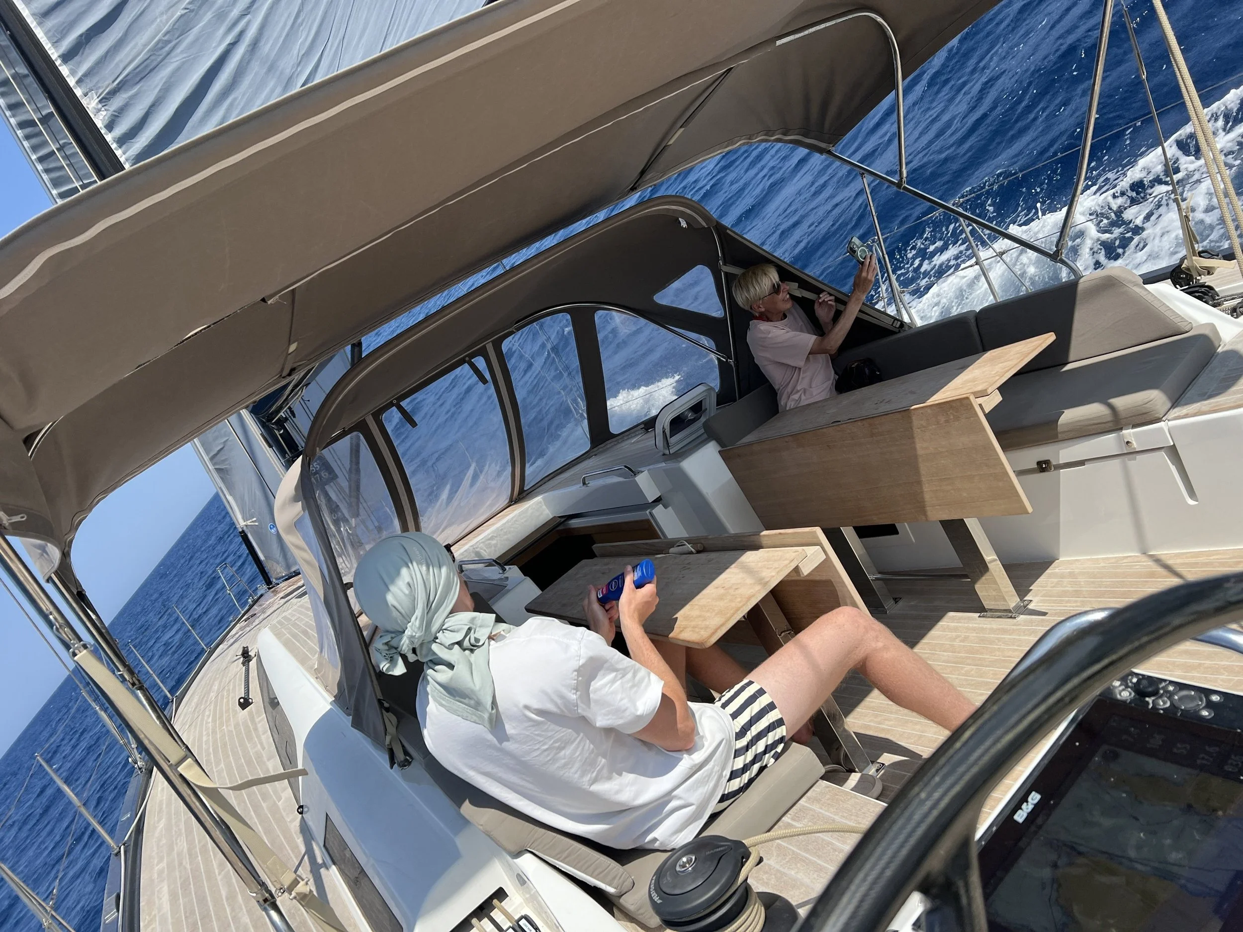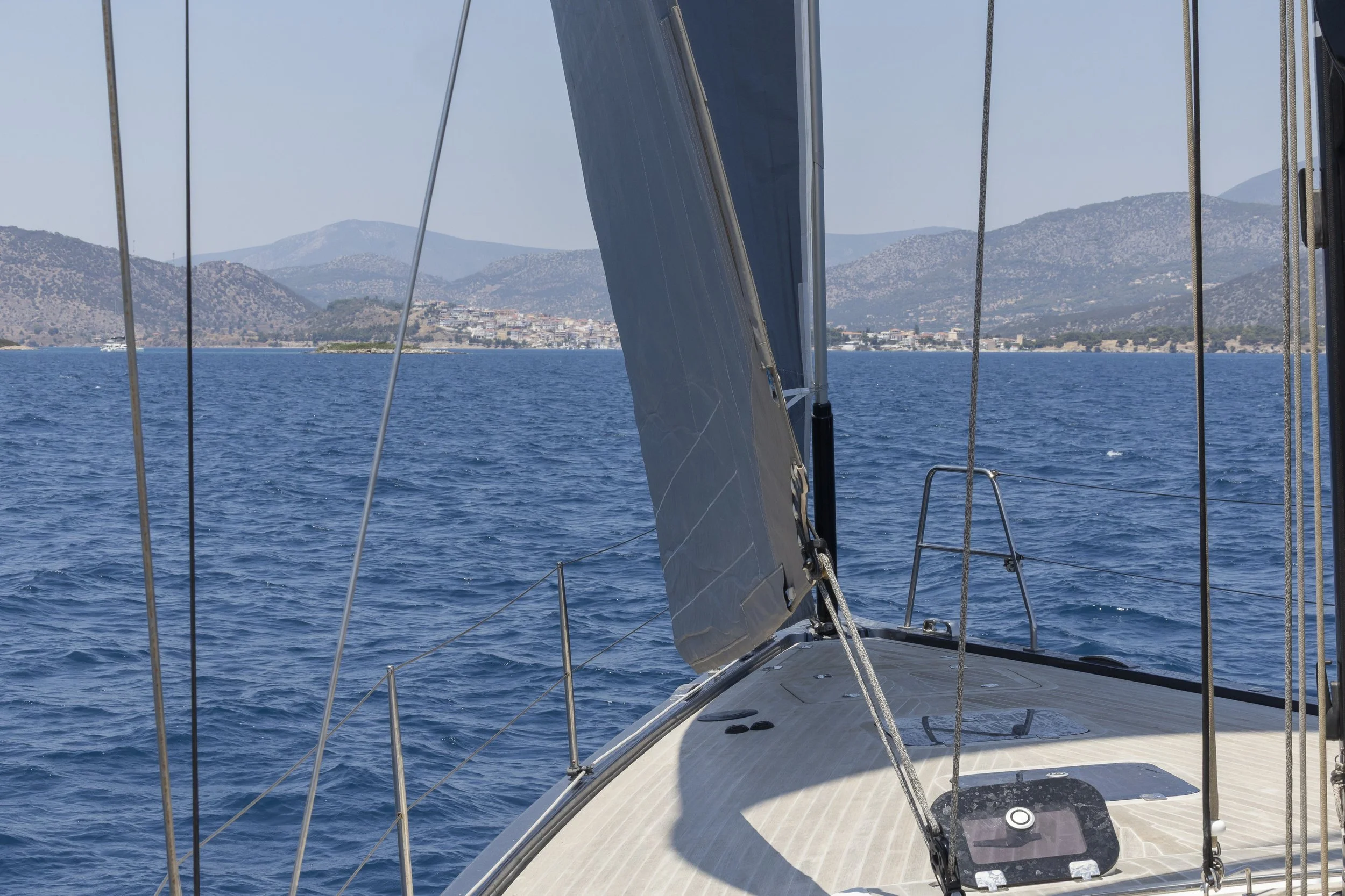 De weergoden blijven ons gunstig gezind, en het traject naar Ermioni kan volledig op zeil afgelegd worden, grootzeil en fok.